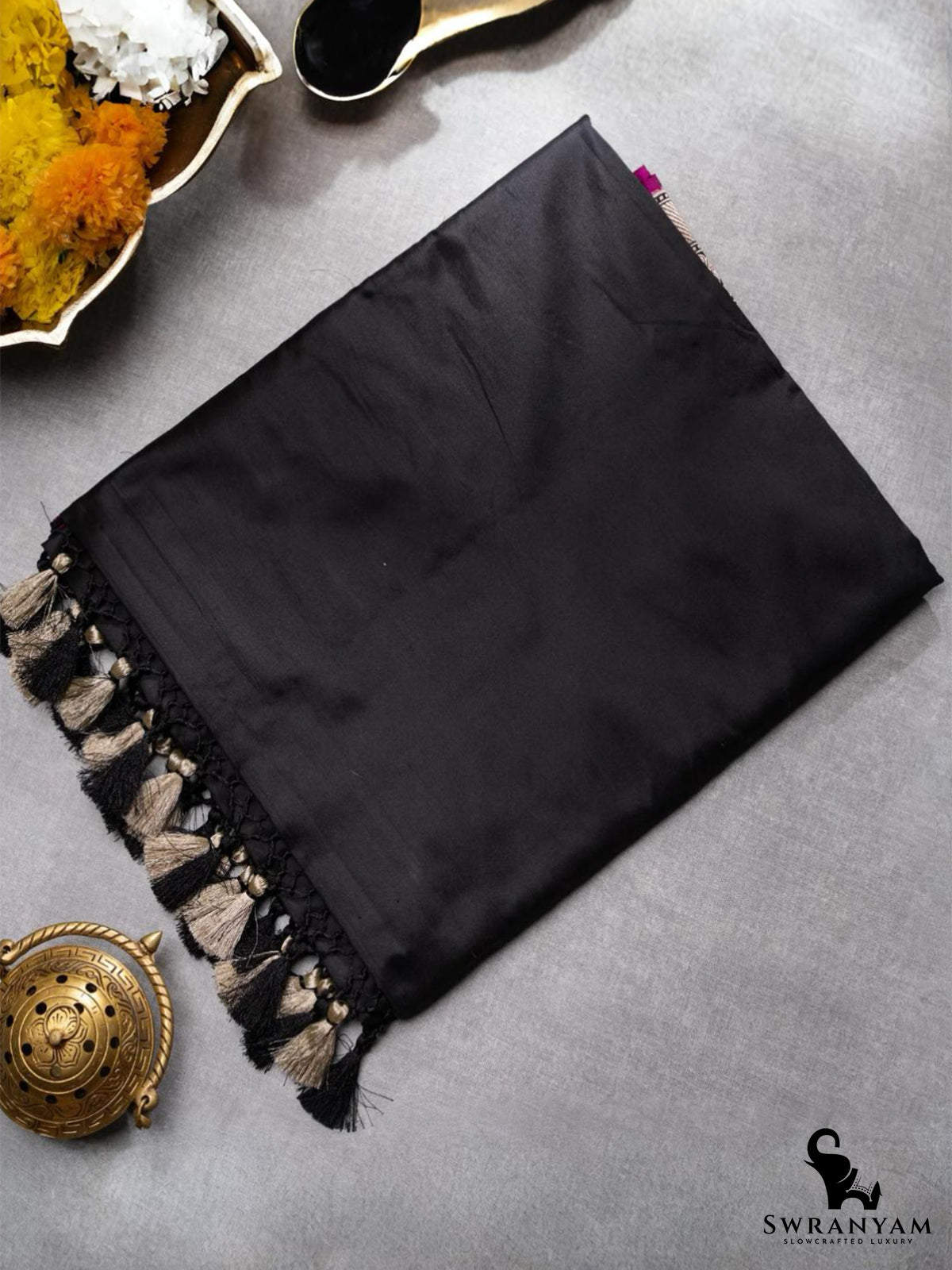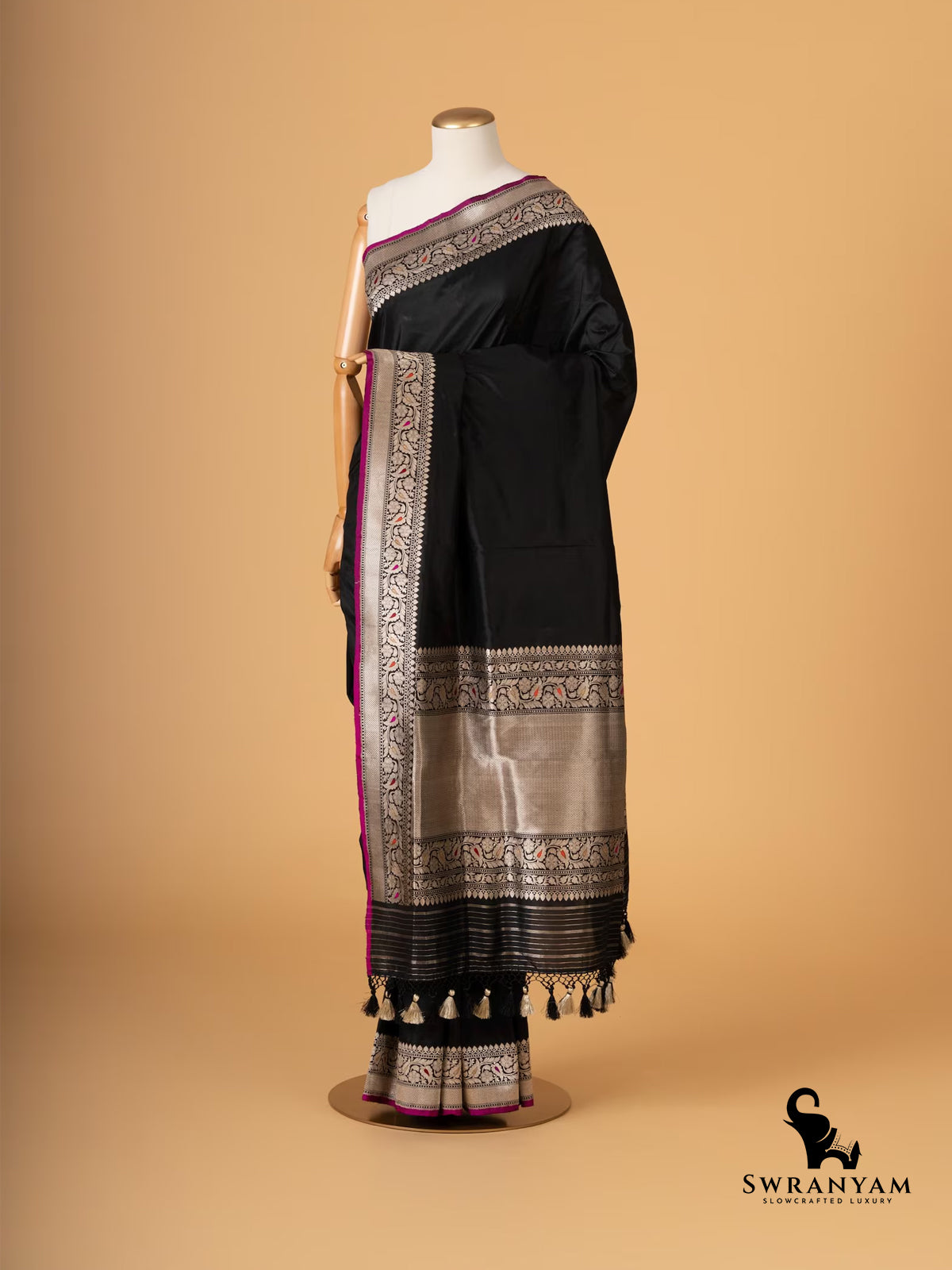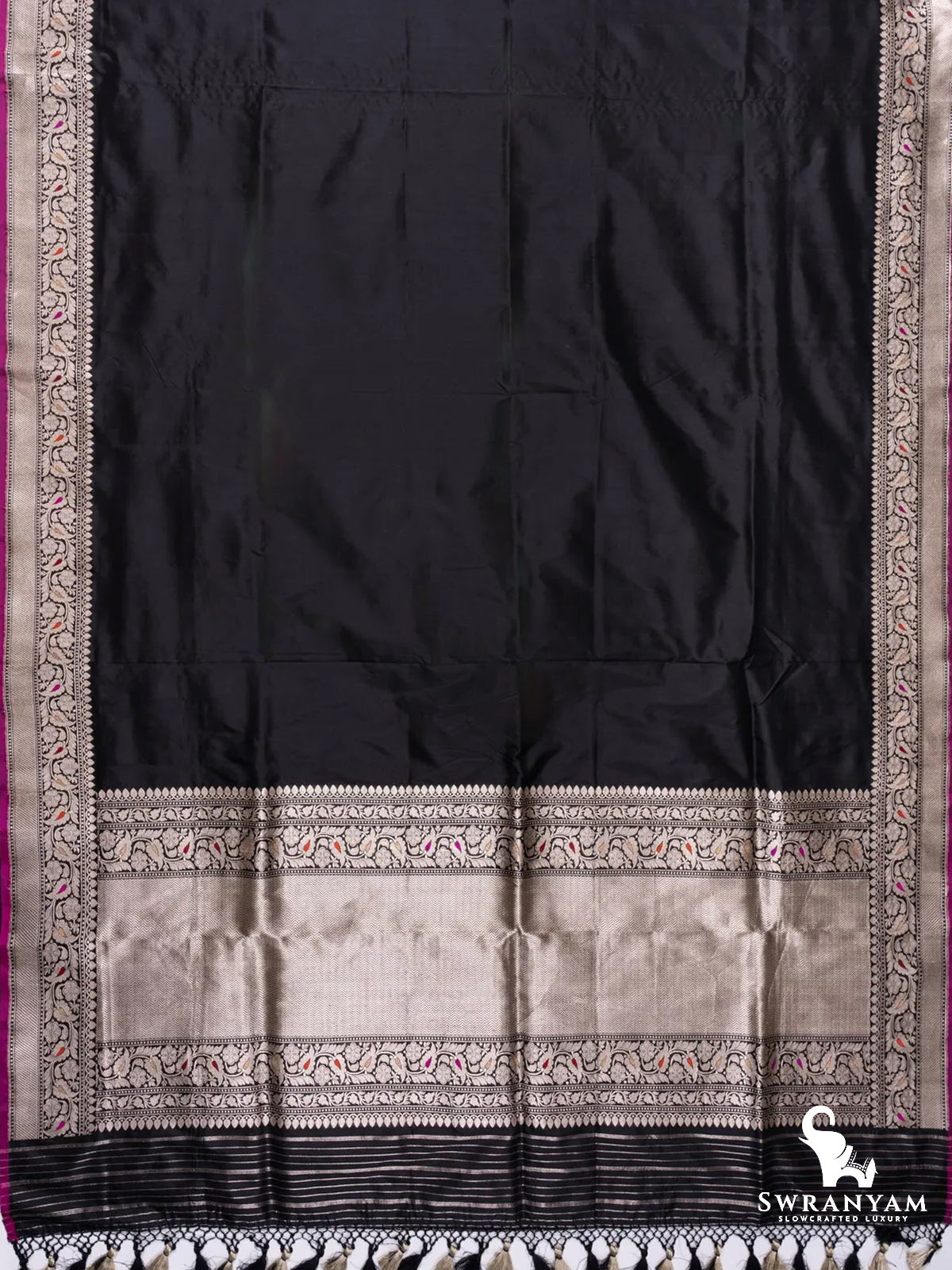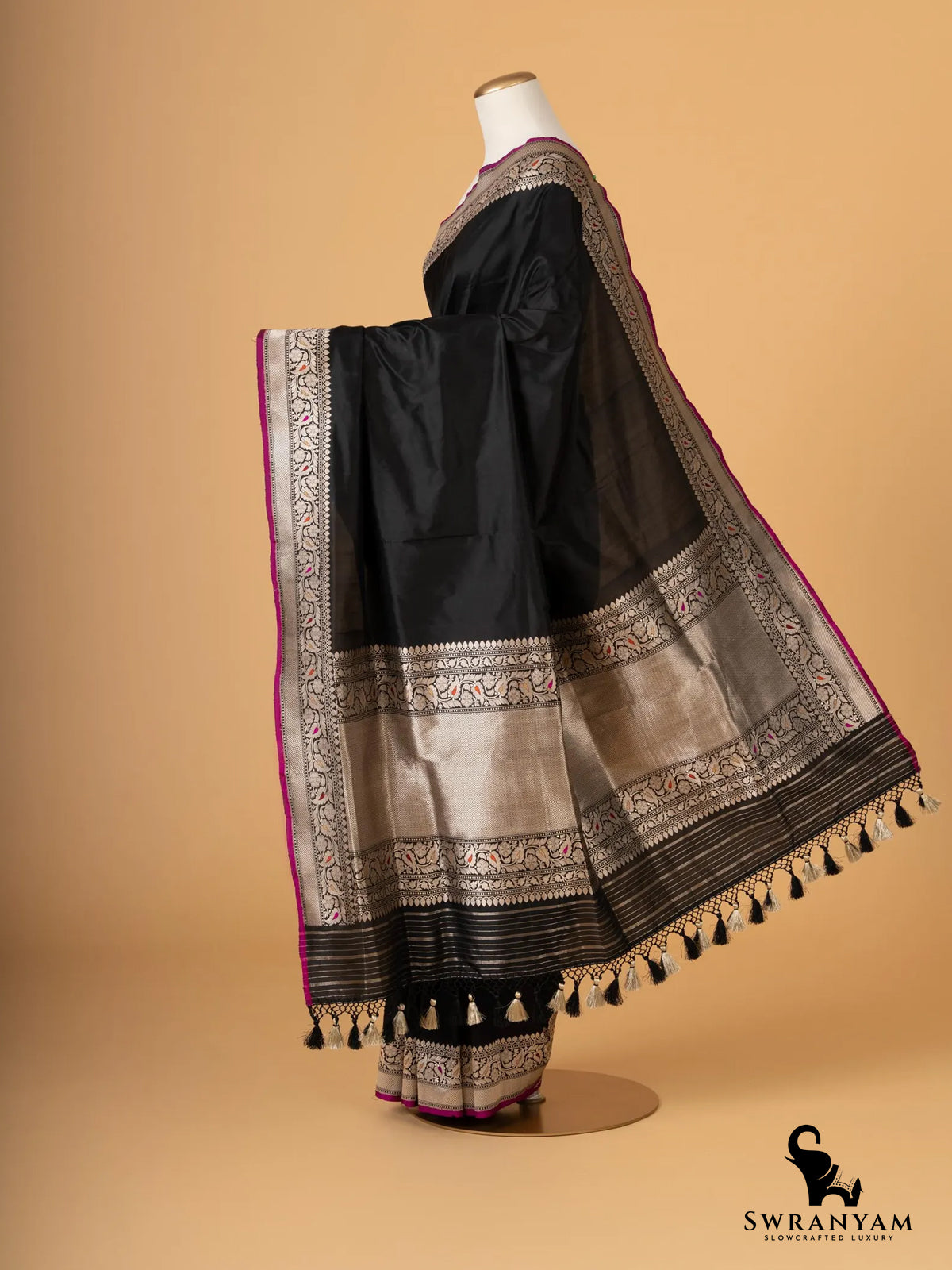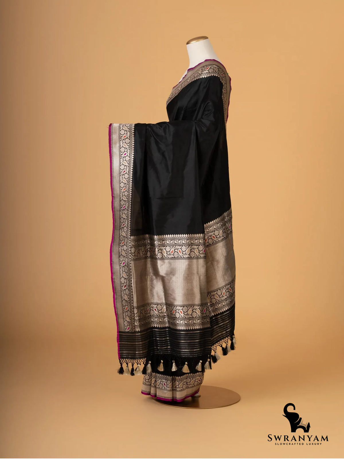 Pure Katan Silk Banarasi Saree in Black with Magenta Zari Border, Bold and Elegant, Silk Mark Certified and Ready to Wear