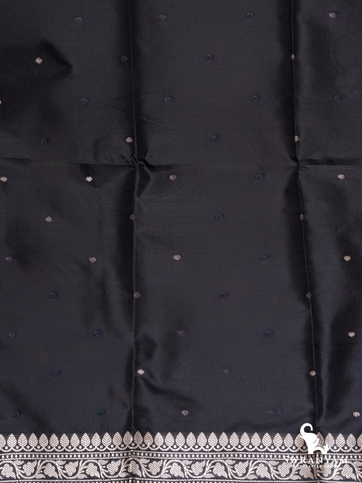 Drape yourself in bold elegance with this Black Banarasi Saree crafted from pure katan silk. The deep black body features a subtle all,over woven design, enhanced by a striking magenta pink zari kadwa border that beautifully fuses richness with sophistication.