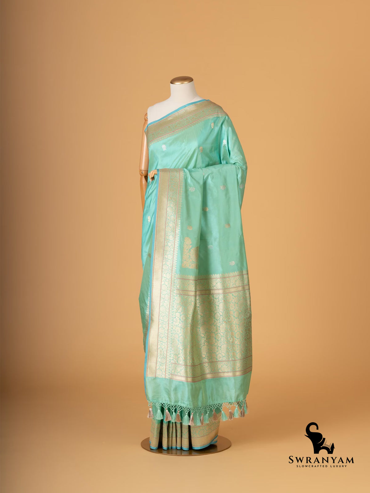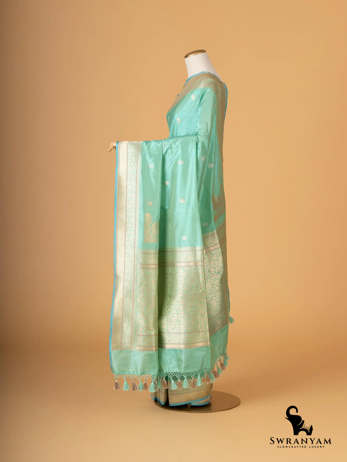 Pure Katan Silk Banarasi Saree in Blue,Green with Water,Gold Kadwa Weave and Zari Border, Regal Grace, Silk Mark Certified and Ready to Wear
