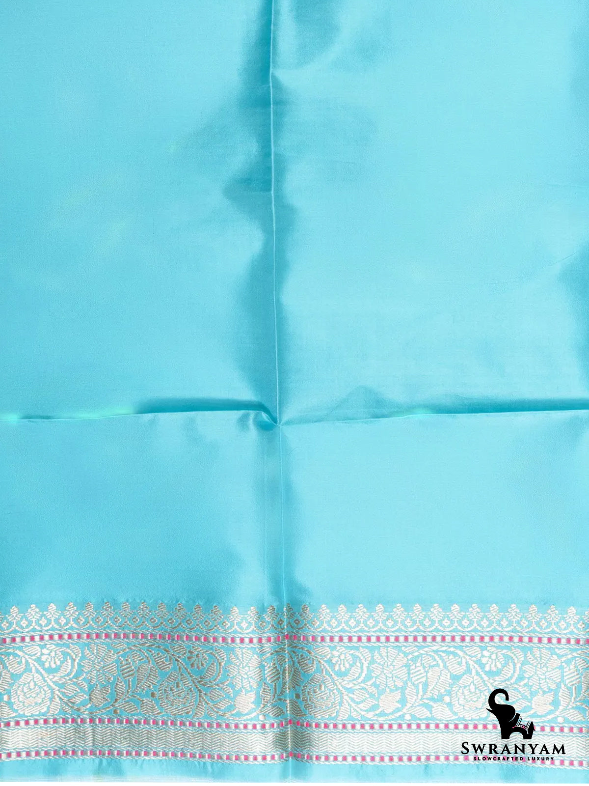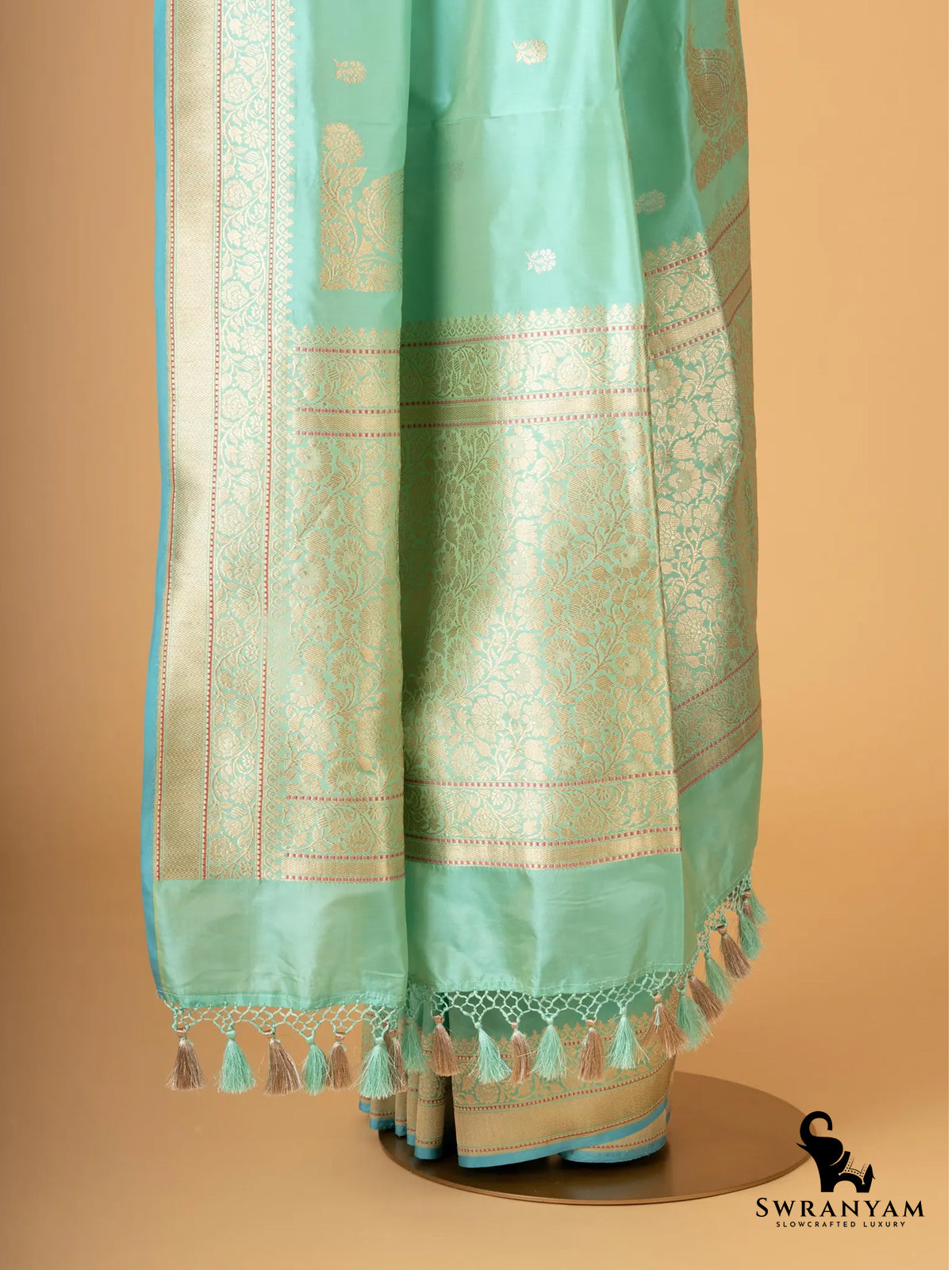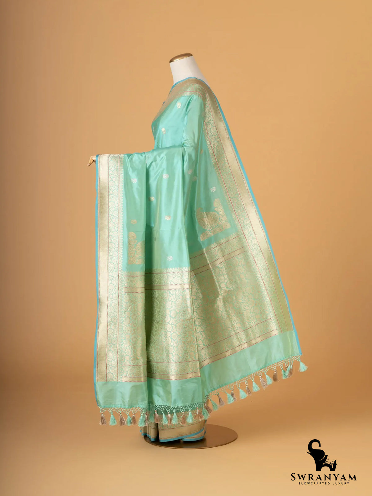 Pure Katan Silk Blue,Green Banarasi Saree with Kadwa Zari Border