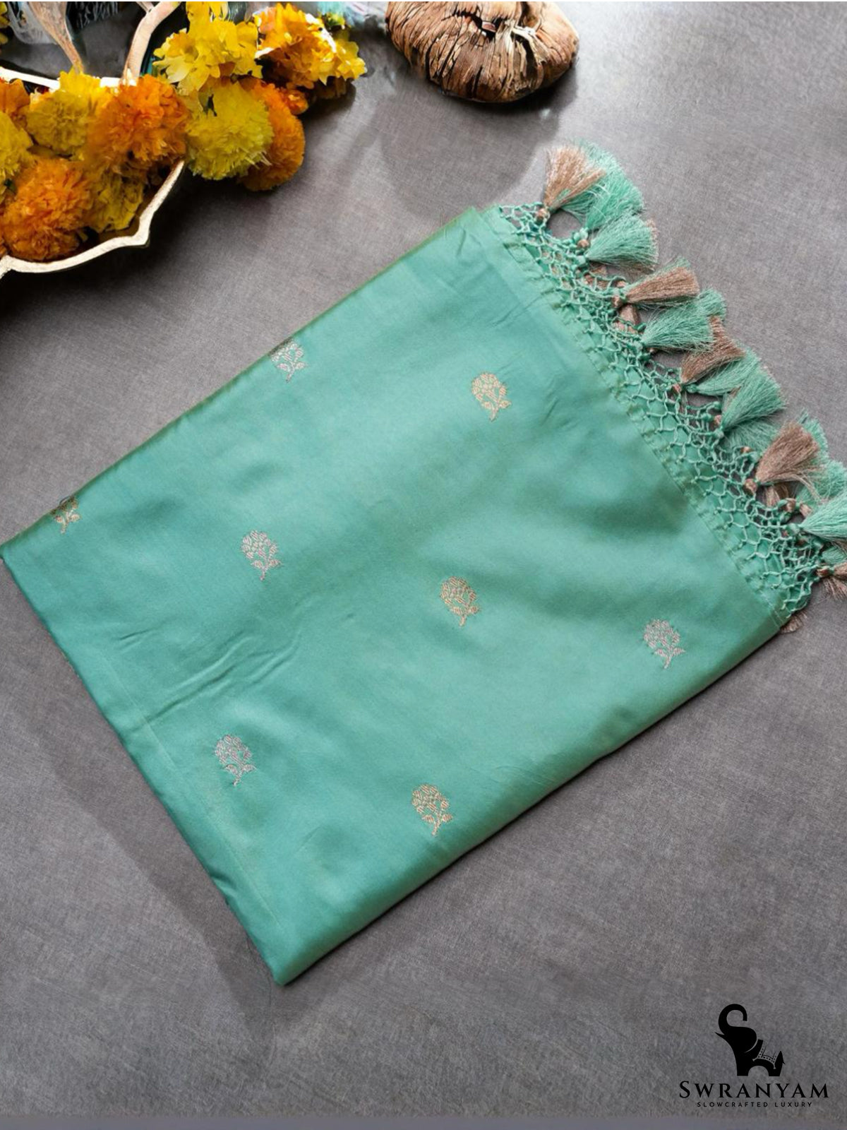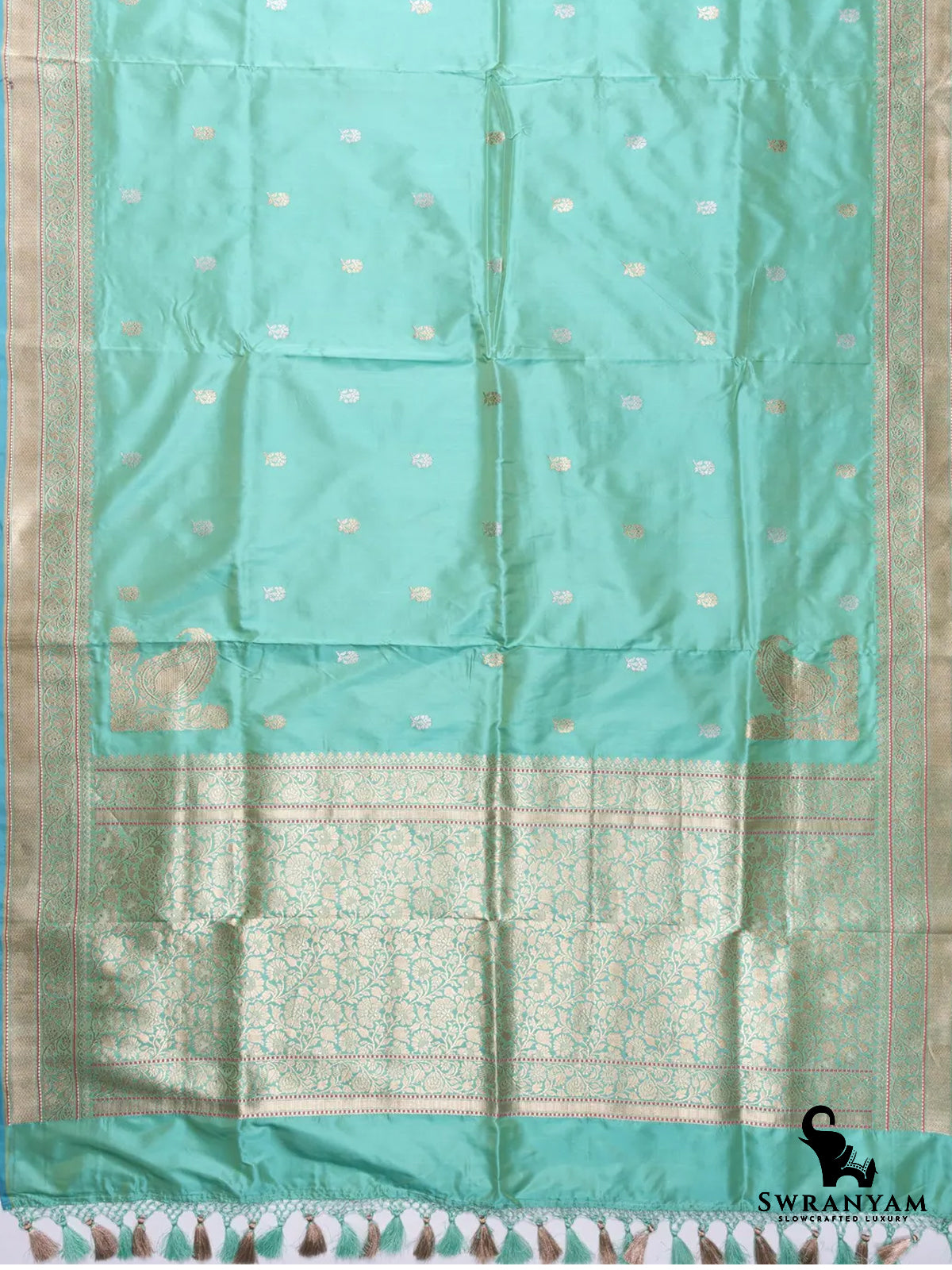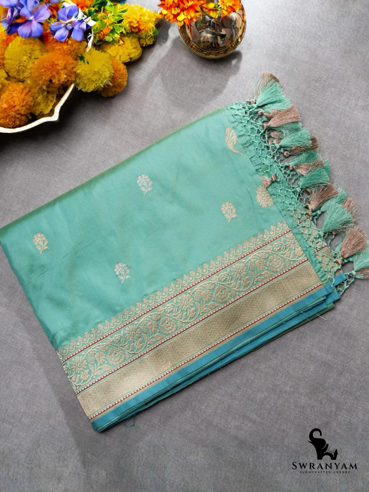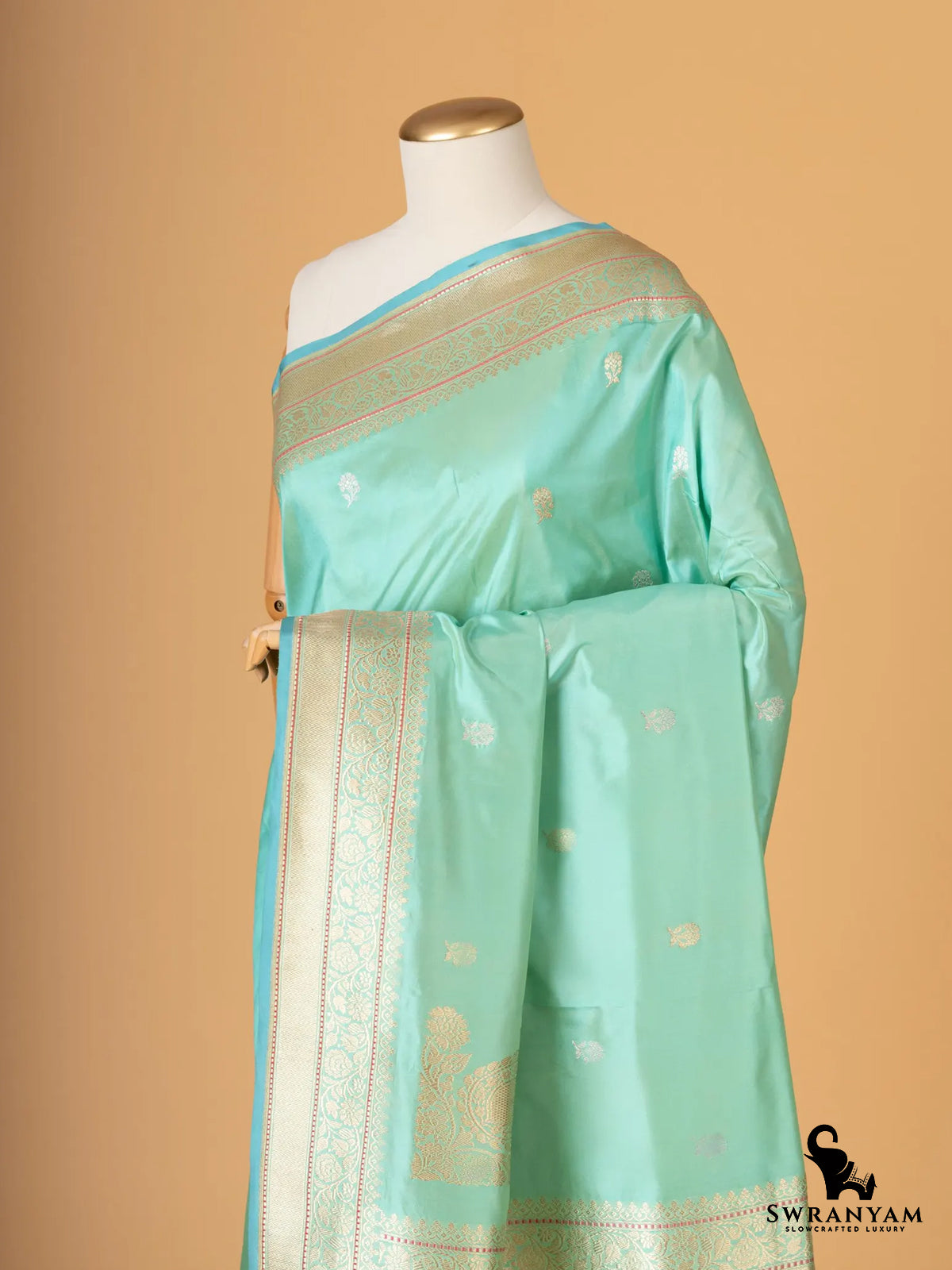 Pure Katan Silk Blue,Green Banarasi Saree with Kadwa Zari Border