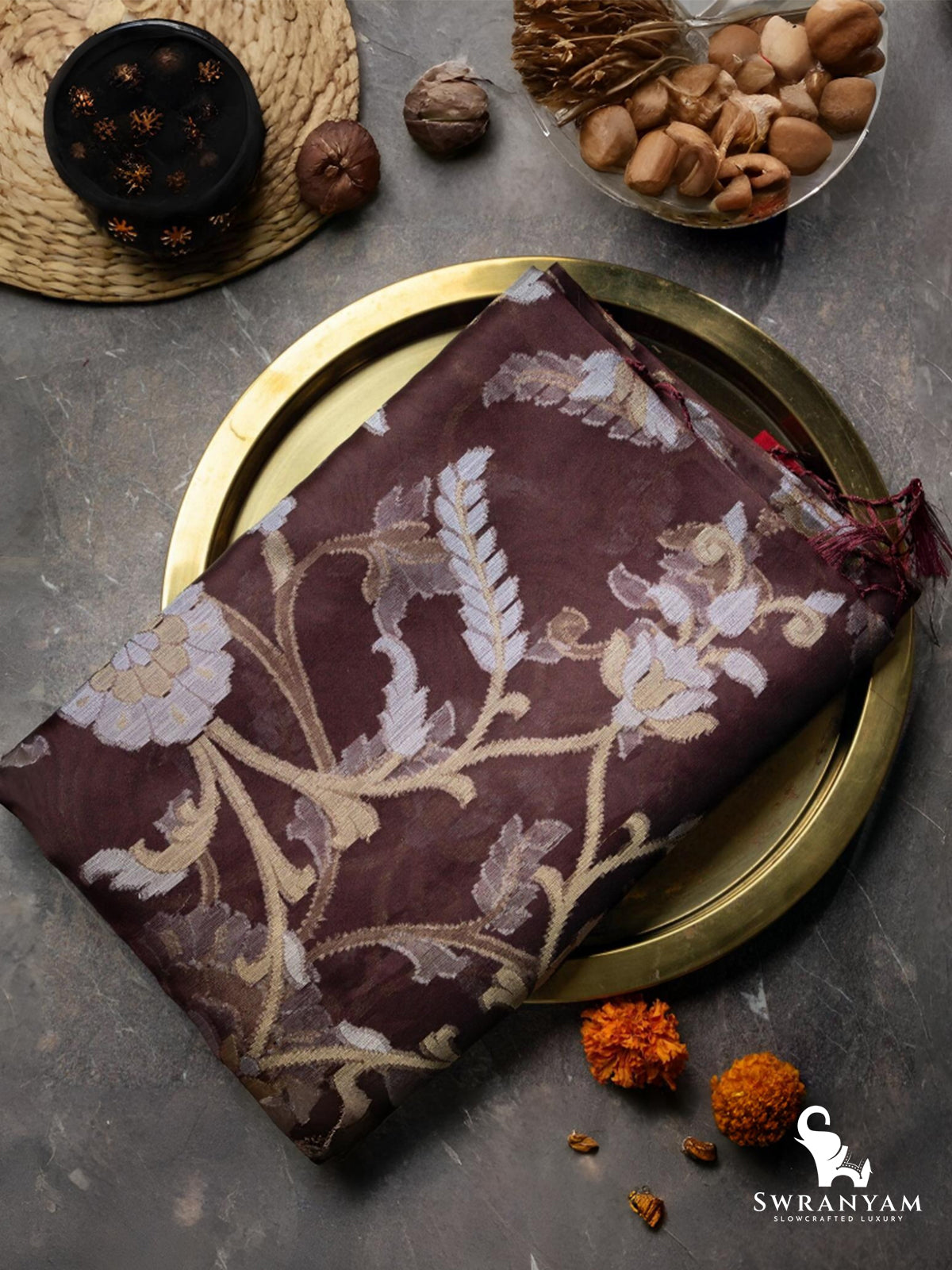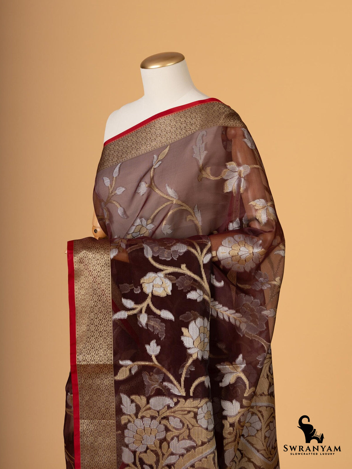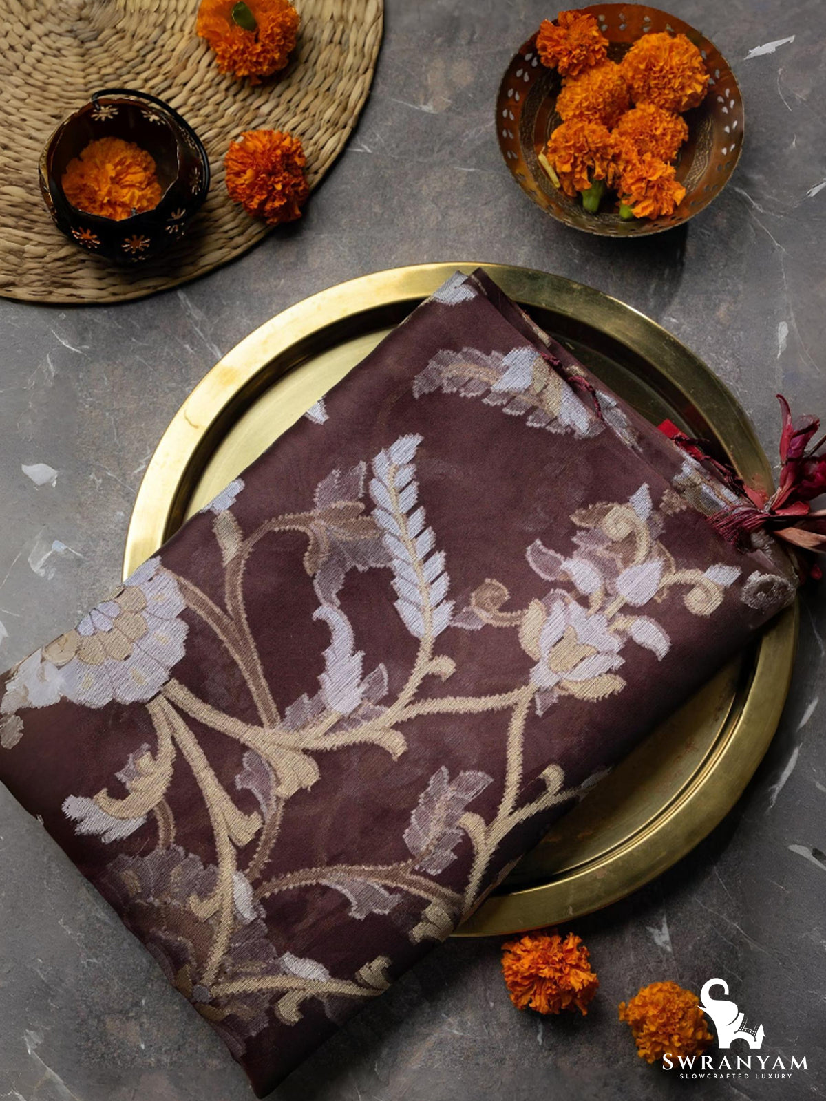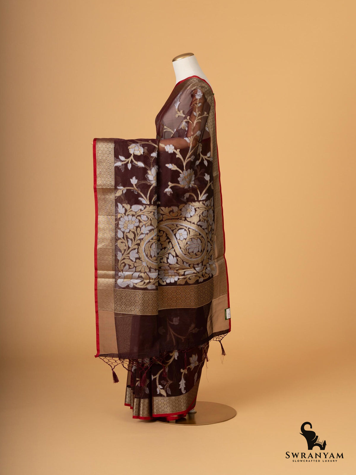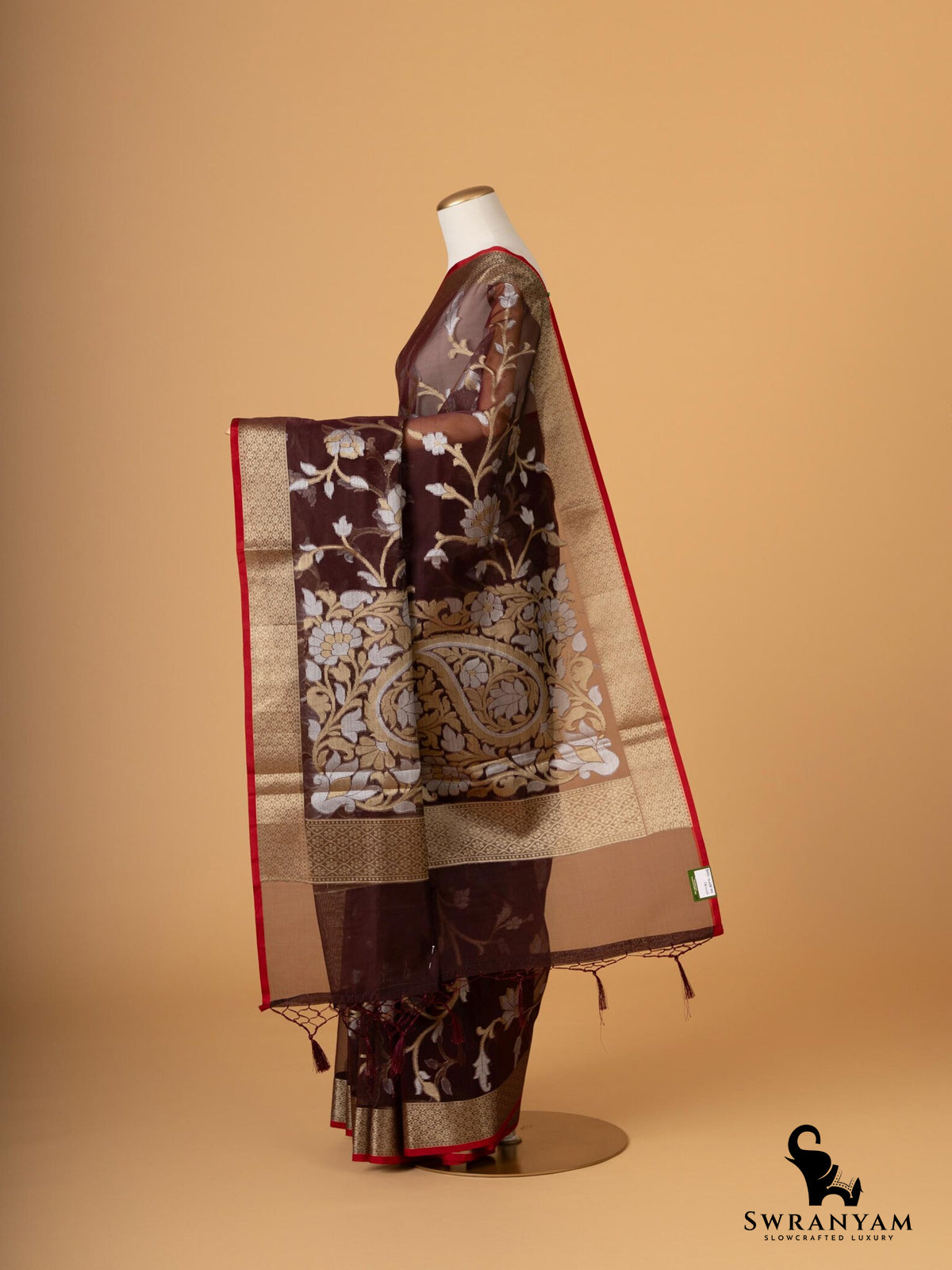 ◆ Includes unstitched brown silk blouse with zari border