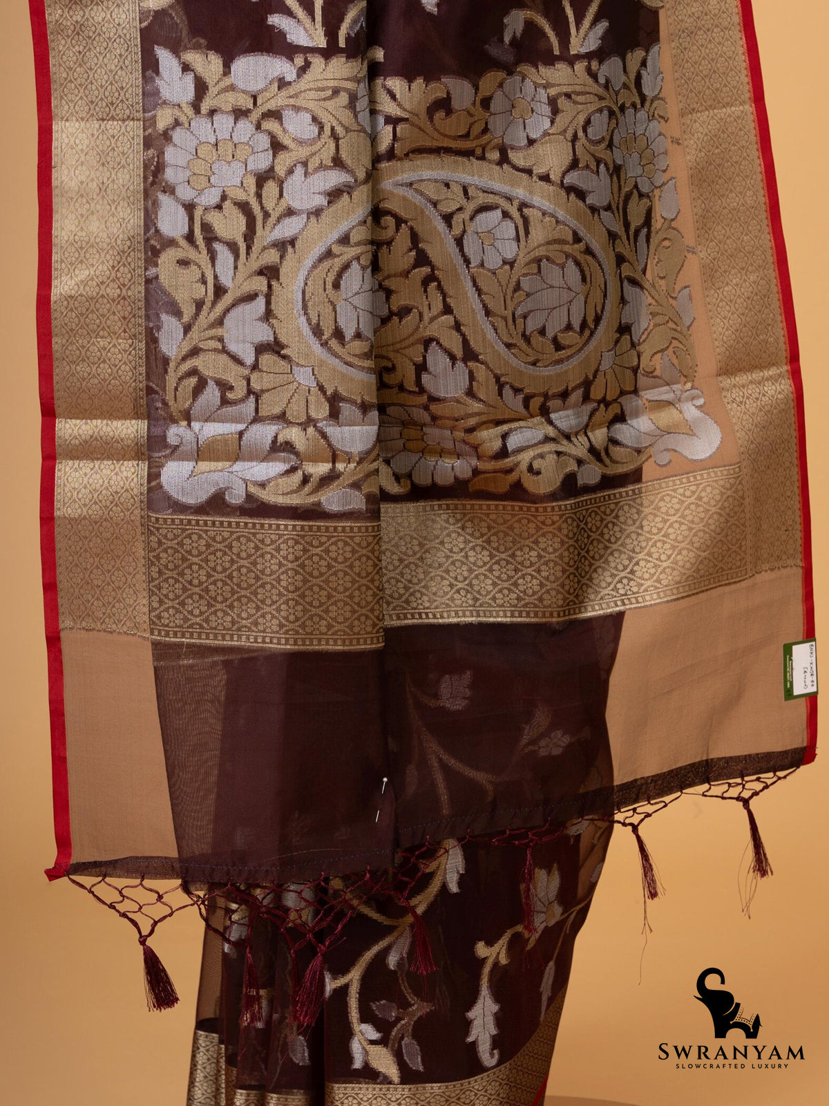 Perfect for weddings, festive gatherings, and elegant occasions, this saree is hand,finished with designer silk tassels and comes ready to wear with fall and pico pre,stitched. Paired with an unstitched brown silk blouse with zari border for versatile styling.