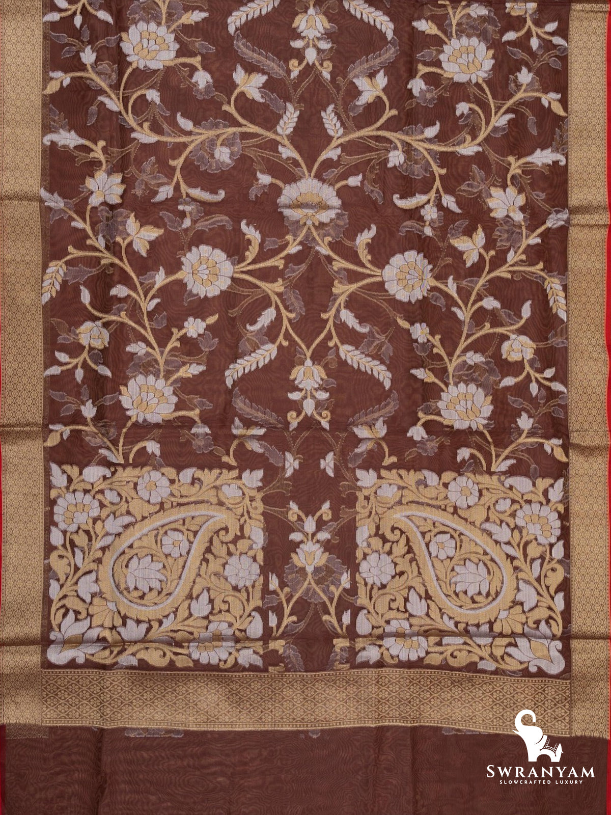 Pure Kora Organza Jamdani Saree in Brown with Zari Woven Design and Red Border, Designer Elegance, Silk Mark Certified and Ready to Wear