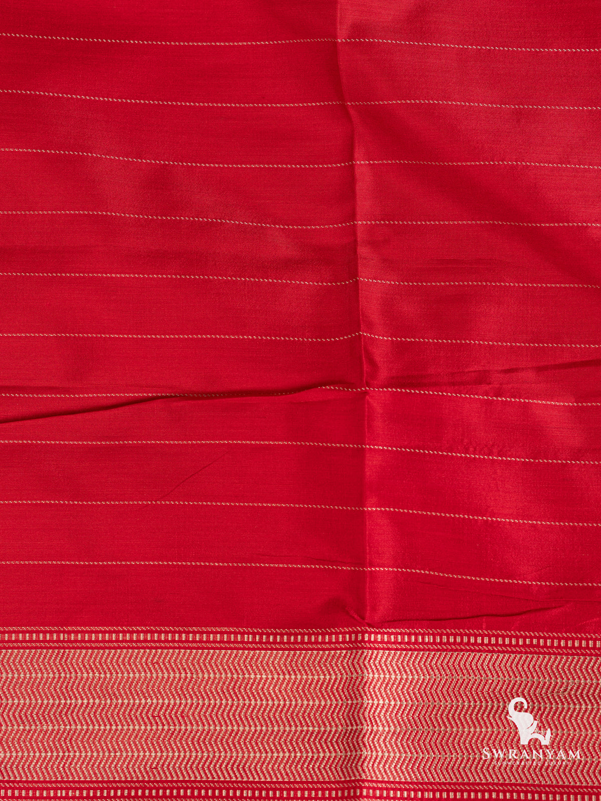 Celebrate timeless tradition with this stunning Pure Red Banarasi Silk Saree – a luxurious handloom creation from SWRANYAM, featuring golden zari brocade throughout the body and a magnificently detailed pallu. Woven in the heart of Varanasi by skilled artisans, this saree is an heirloom,worthy piece perfect for brides, wedding guests, and festive occasions.