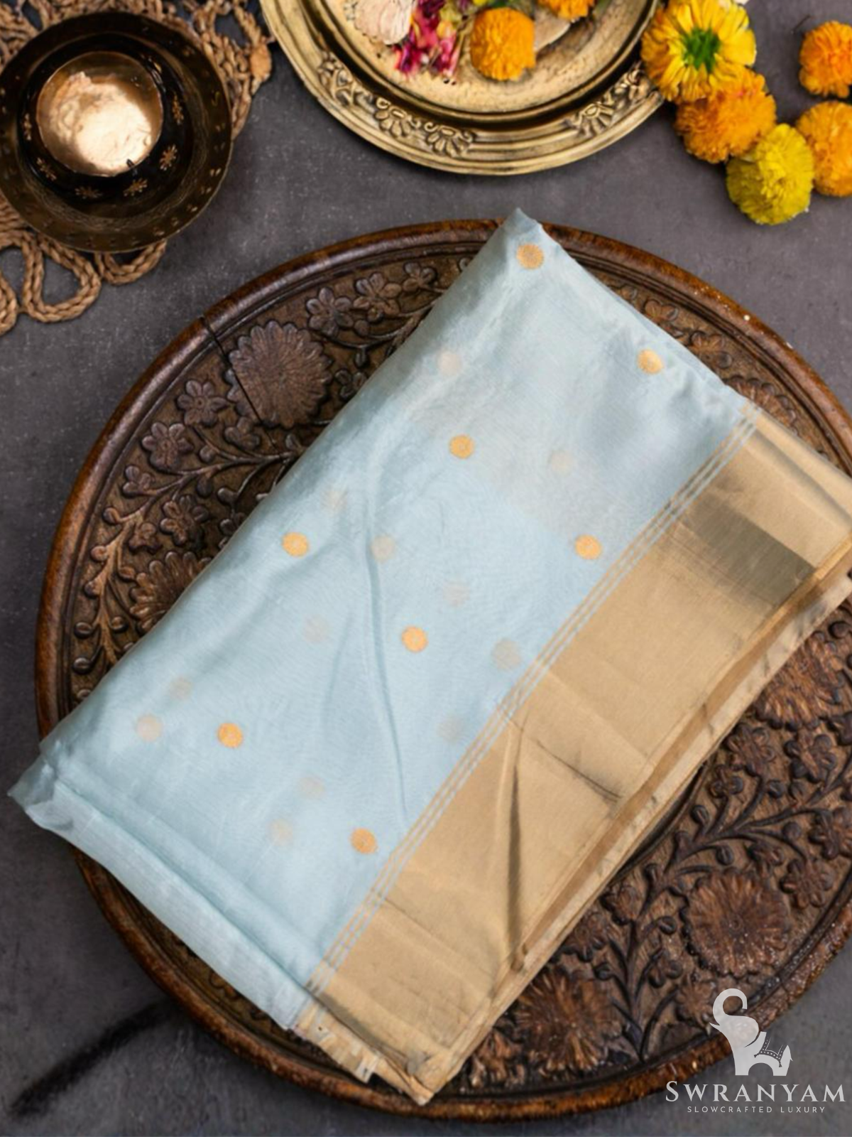 Sky Blue Chanderi Pattu Handwoven Saree with Gold Polka Motifs and Border