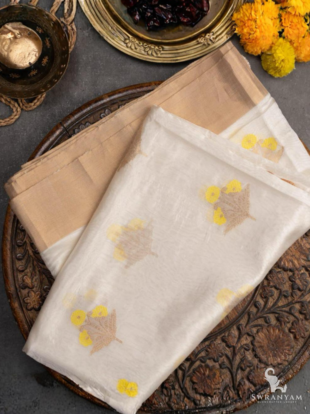 Ivory Chanderi Handwoven Saree with Yellow Floral Motifs