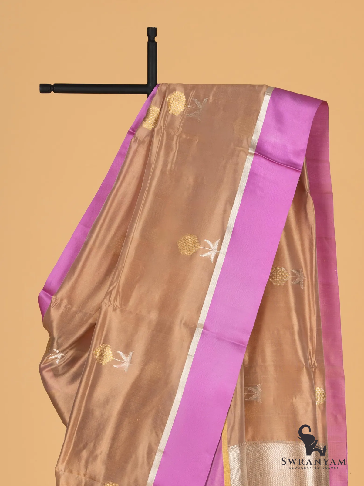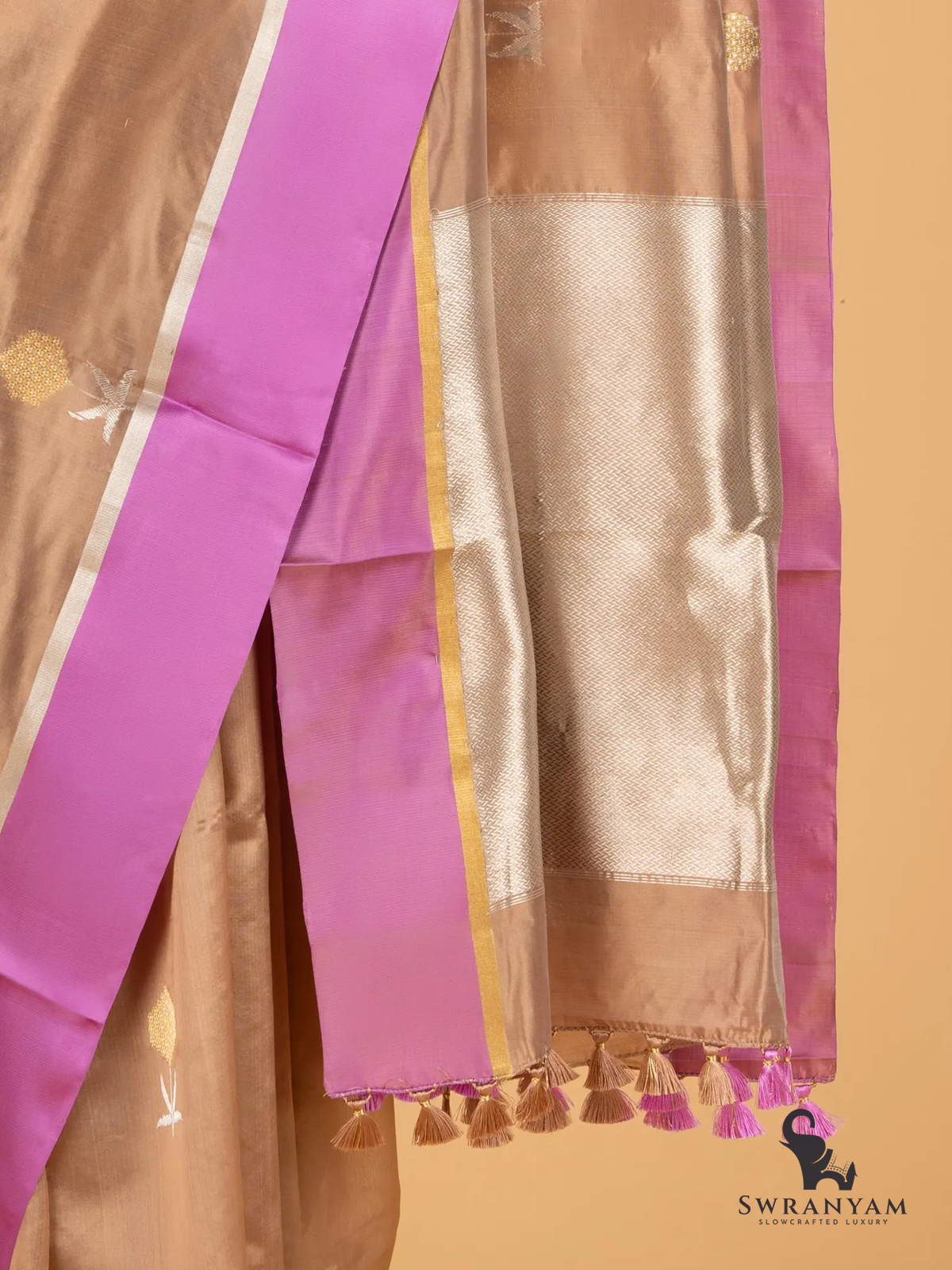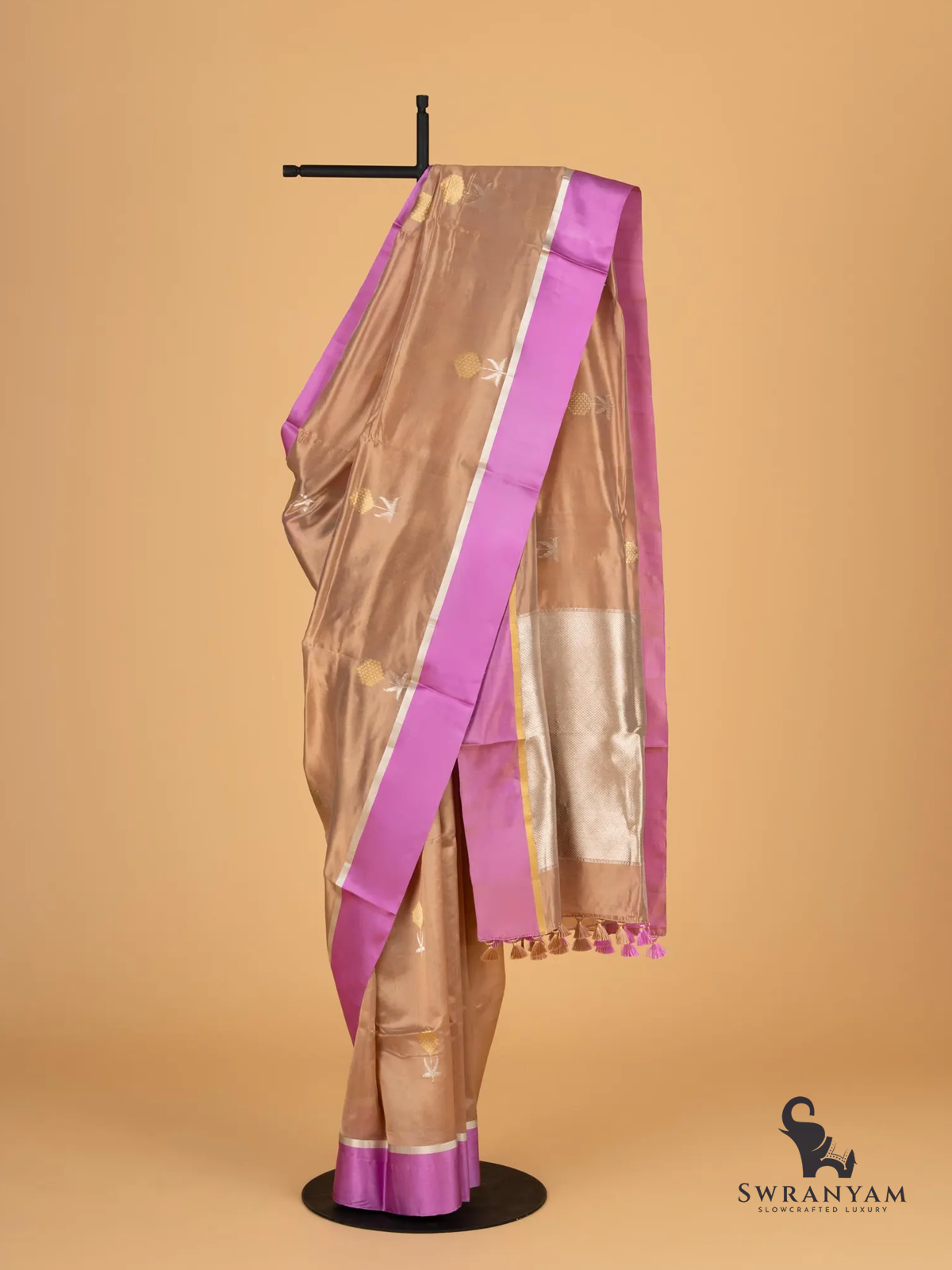 Brown Chanderi Handwoven Mashru Silk Saree with Yellow and Silver Floral Motifs