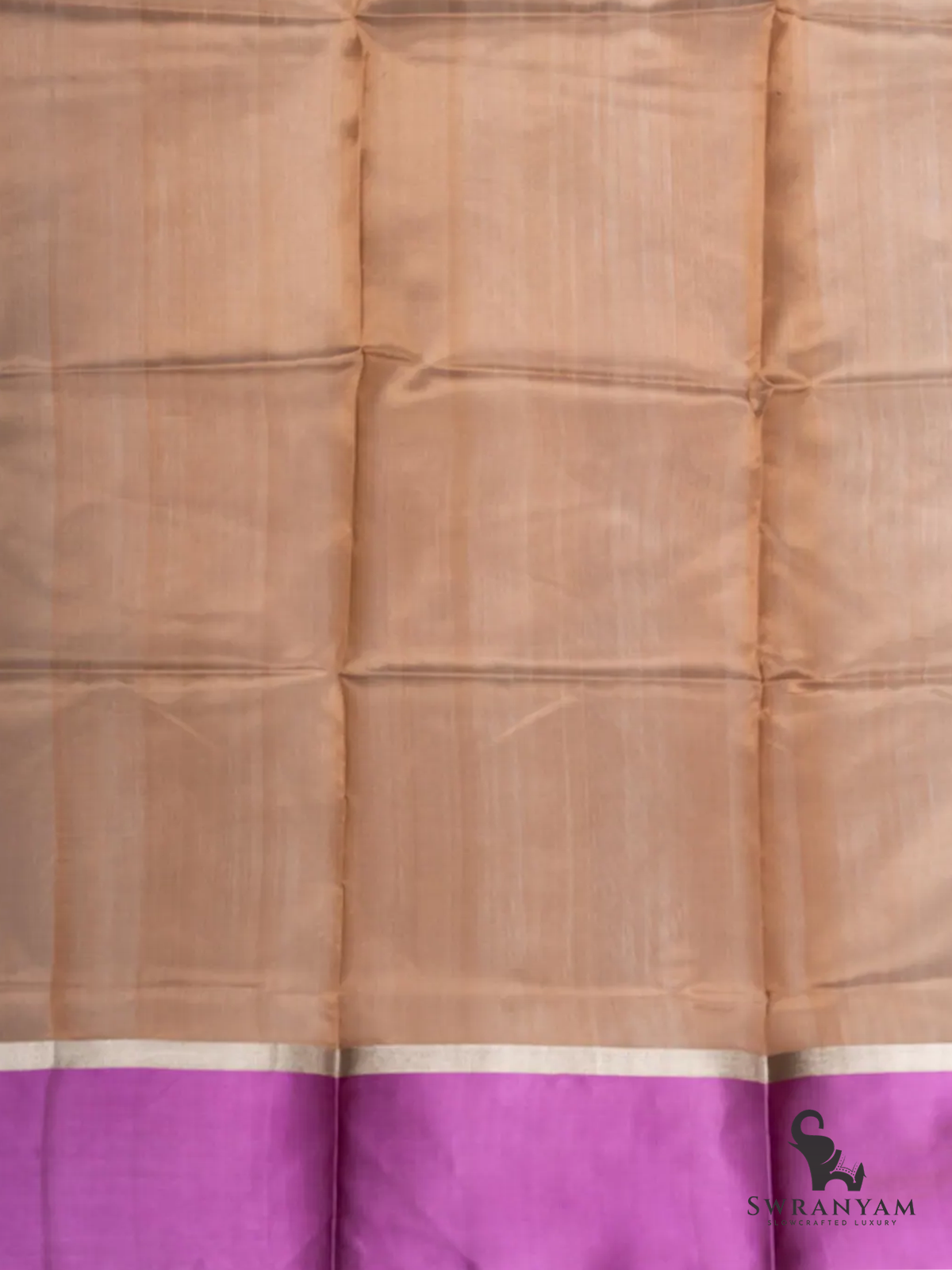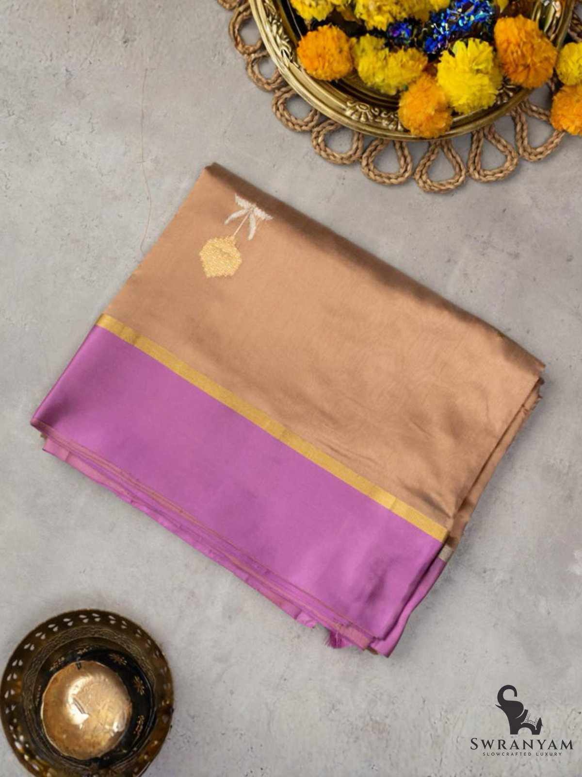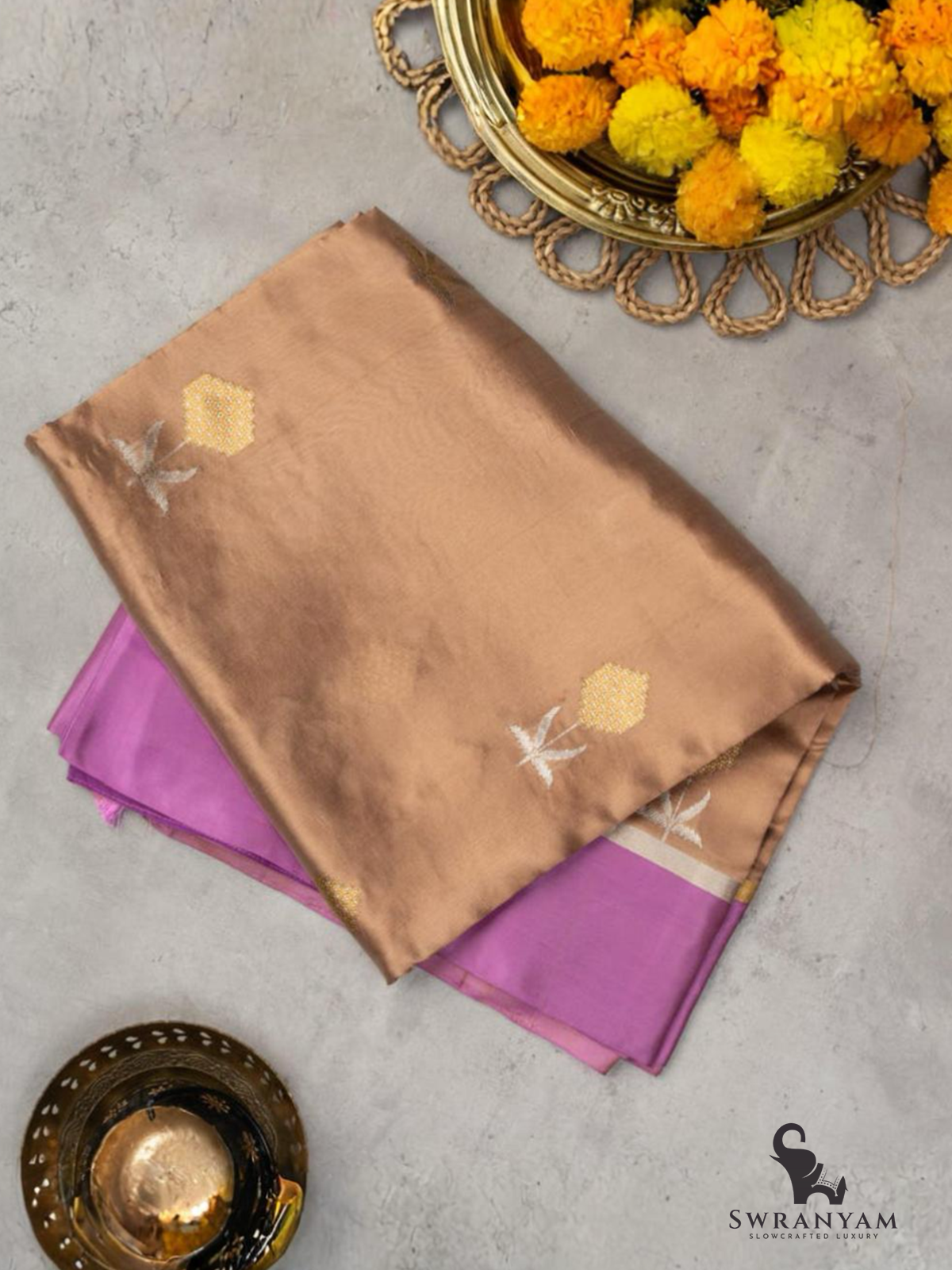 The fresh Brown weave body dances subtly with delicate Yellow and Silver floral motifs, while the Purple mashru silk border and pallu create a vibrant frame that turns every glance into admiration. Whether you're attending a festive celebration or simply embracing your heritage, this piece is sure to be your go-to symbol of elegance. A delicate touch of handmade tassels on the pallu adds a soft, luxurious finish that flows with grace.