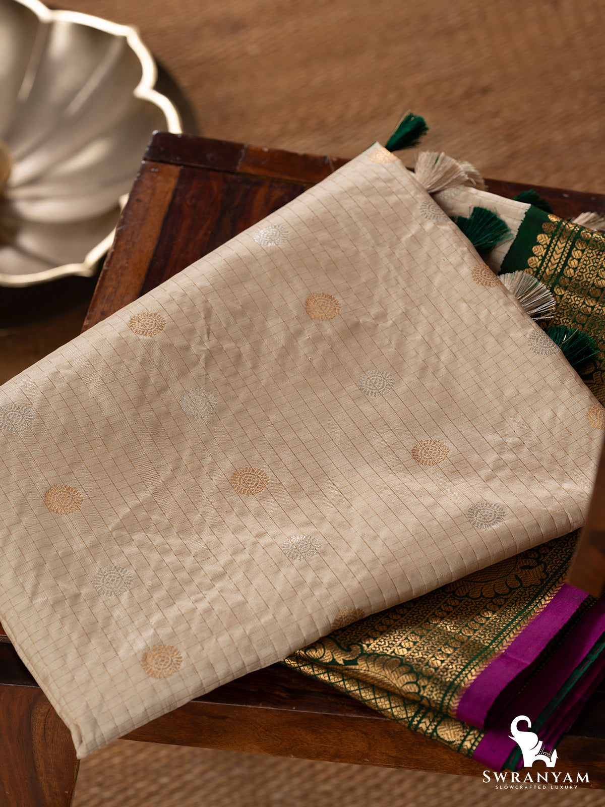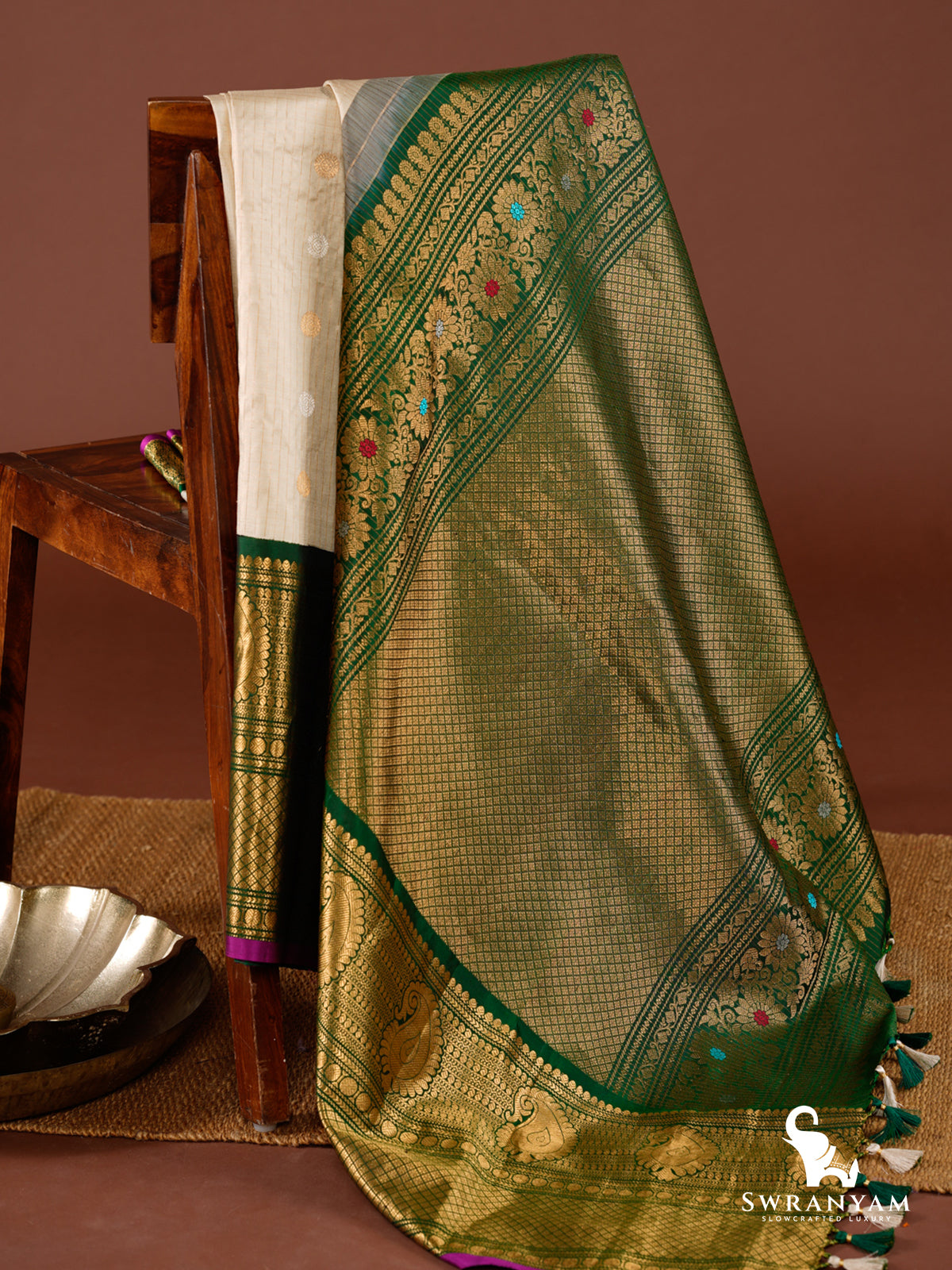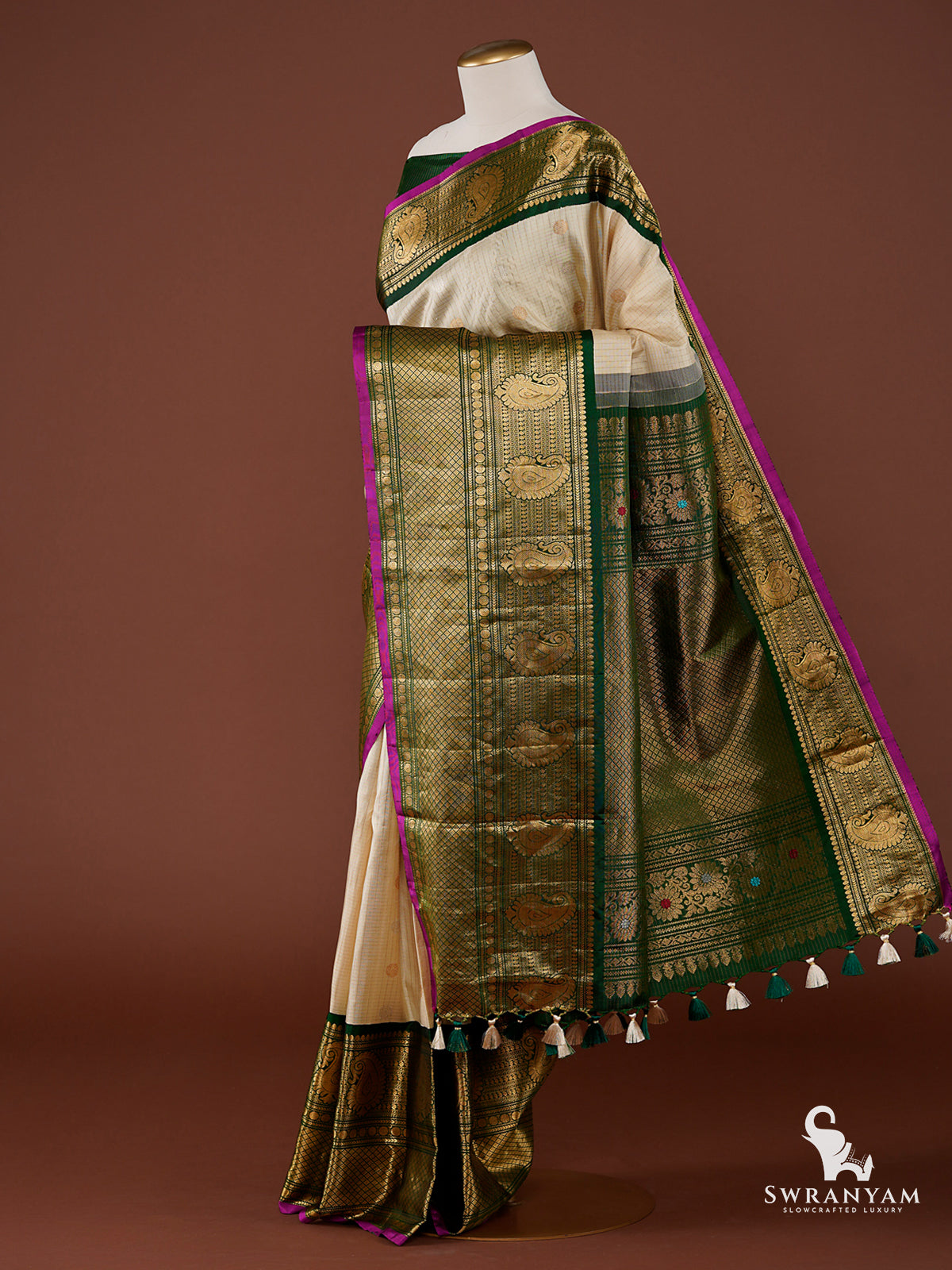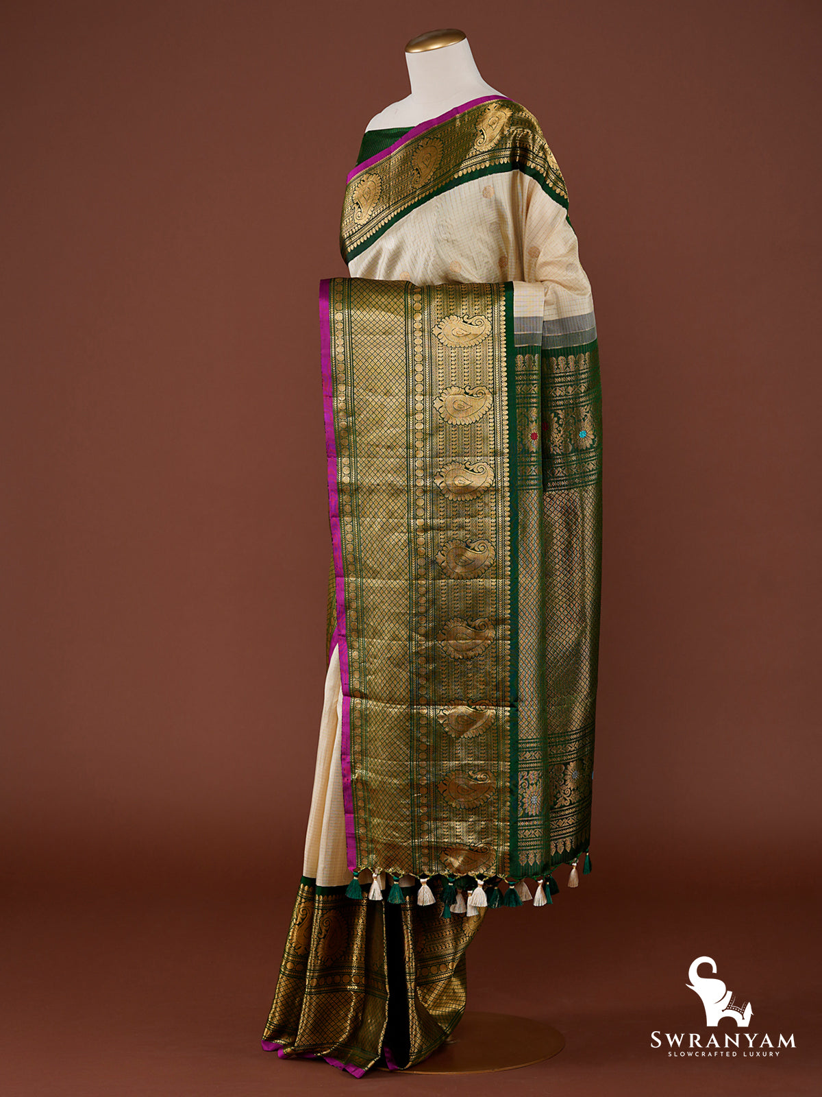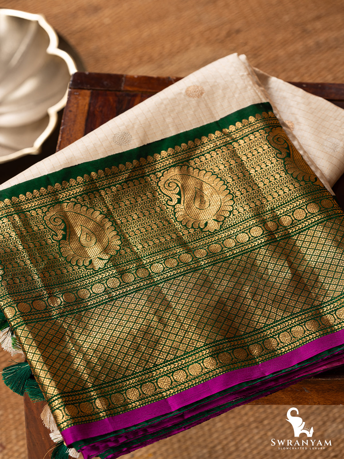 The cream silk body is adorned with delicate zari checks and traditional paisley motifs, while the rich green borders and opulent pallu shine with golden temple-inspired woven designs. A striking contrast purple piping adds a unique design touch. Handcrafted multicolor tassels finish the pallu with finesse. Whether you're attending a wedding or a grand celebration, this saree will make you feel graceful and rooted in tradition.
