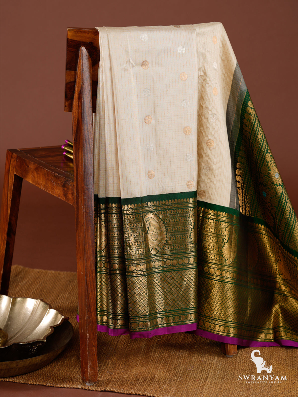 Pure Cream and Green Gadwal Silk Saree with Rich Zari Checks, Paisley Motifs, Contrast Purple Piping and Temple Border – Silk Mark Certified, Lightweight and Ready to Wear.