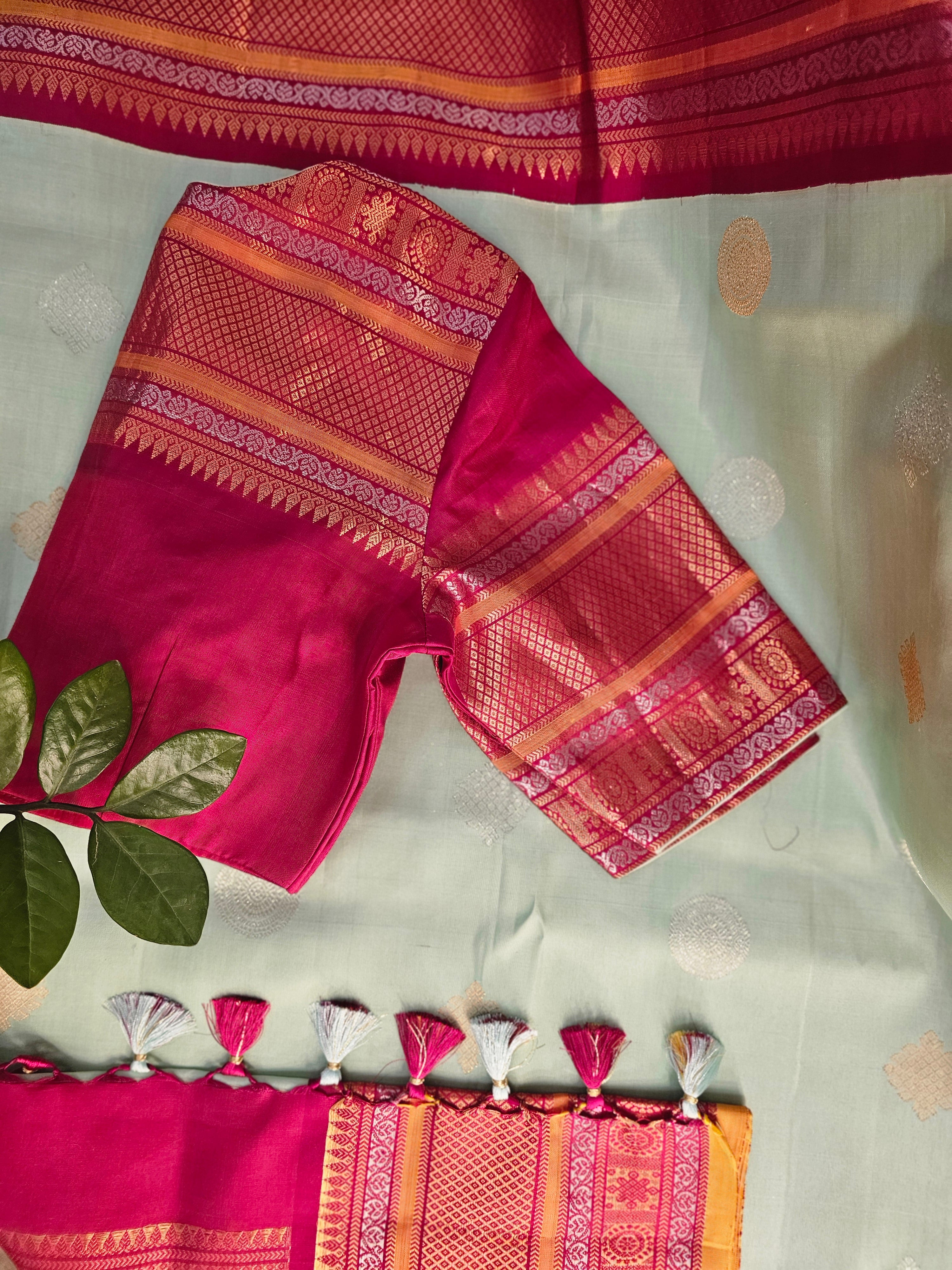◆ Includes stitched silk blouse (Size 38 – extends up to 42) with woven border