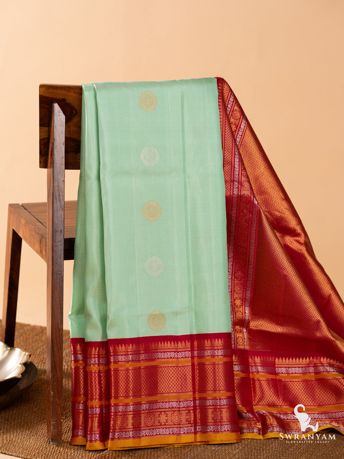 ◆ Elegant pista green body with bold red Kanchi-style borders