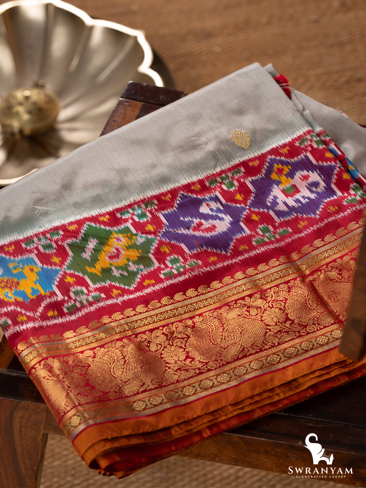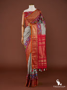 Kanjivaram silk Ikat Bluish Grey Red Figure motif handwoven Saree