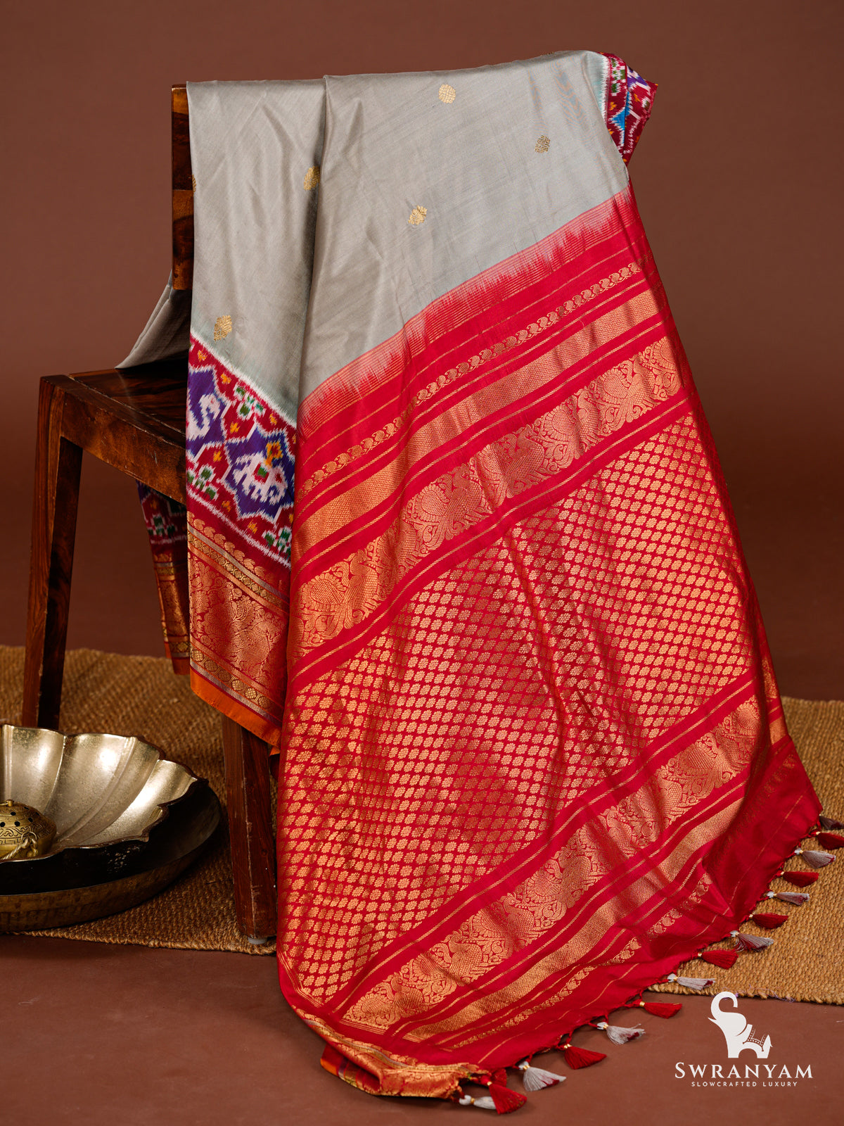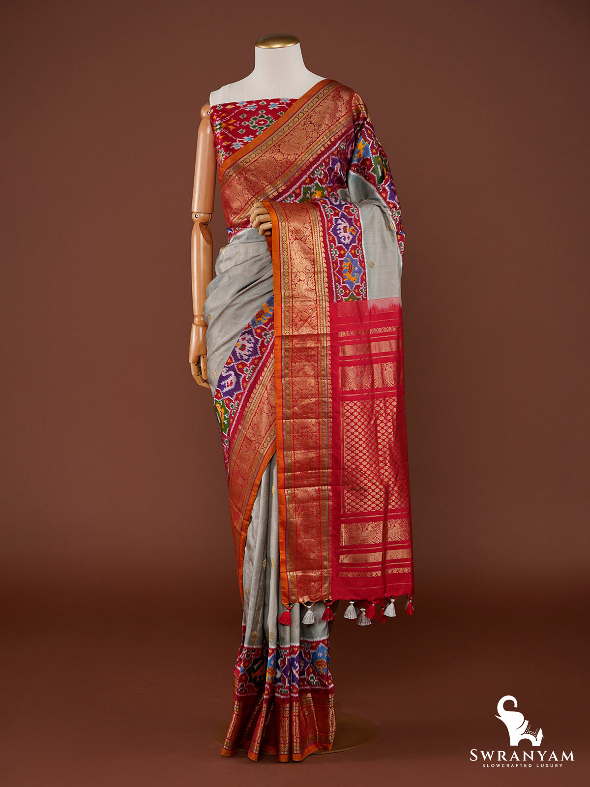 Handmade designer silk tassels adorn the pallu