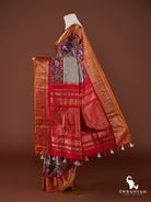 Pure bluish grey and red Ikat Kanjeevaram borders fusion silk saree with figure motifs and buta, Silk Mark certified, lightweight & ready to wear.