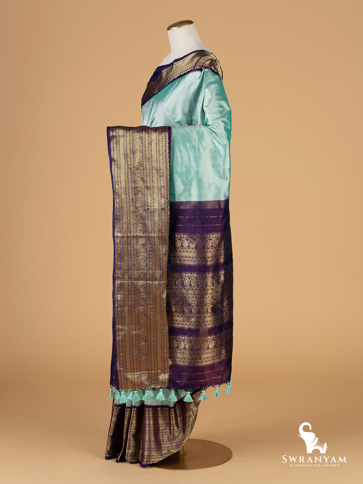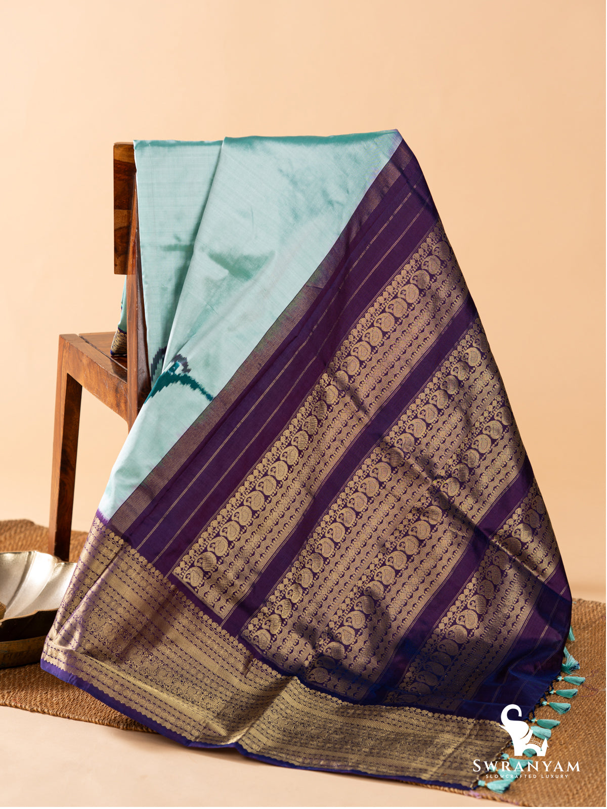 Kanchi Ikkat with handwoven bird motifs gracefully adorns the mint blue silk body, while the deep purple Kanchi silk borders and a richly woven pallu create a temple,inspired frame. Whether you're dressing up for a festive gathering or celebrating culture in your own way, this saree promises to be a cherished addition to your wardrobe. Delicate handcrafted silk tassels on the pallu add a luxurious final touch.