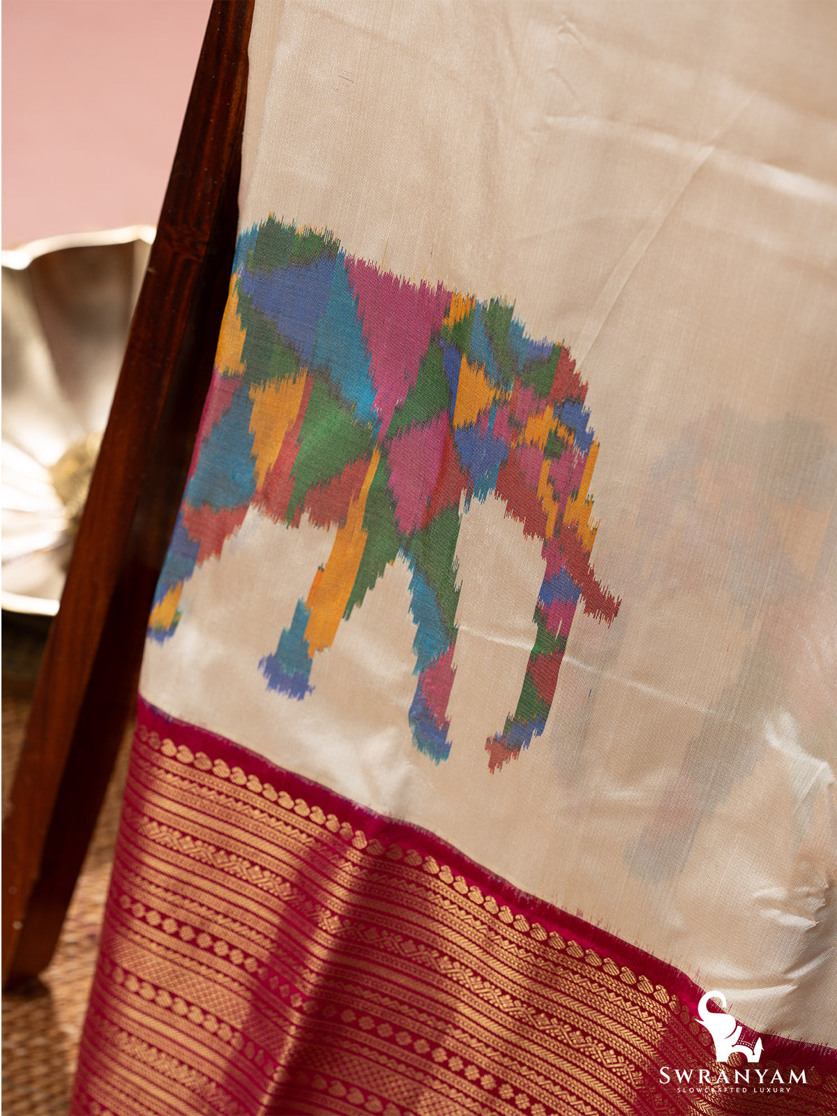 ◆ White silk body with handwoven elephant motifs