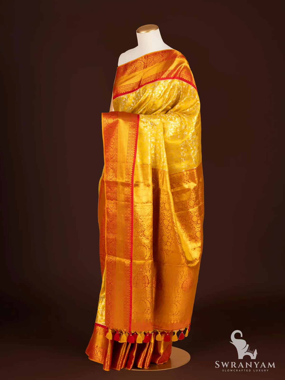 Pure Golden yellow Red border Kanchipuram bridal silk Saree with Jamdani Floral Weave all over the saree, Designer Elegance, Silk Mark Certified and Ready to Wear