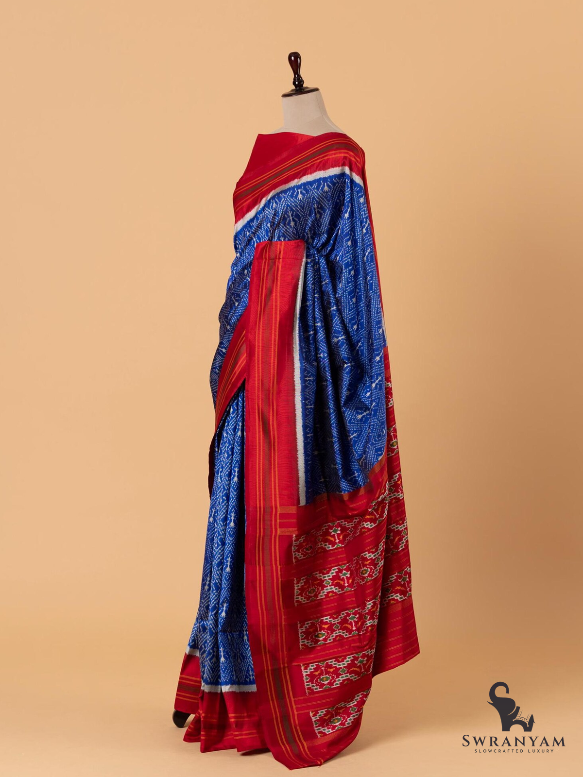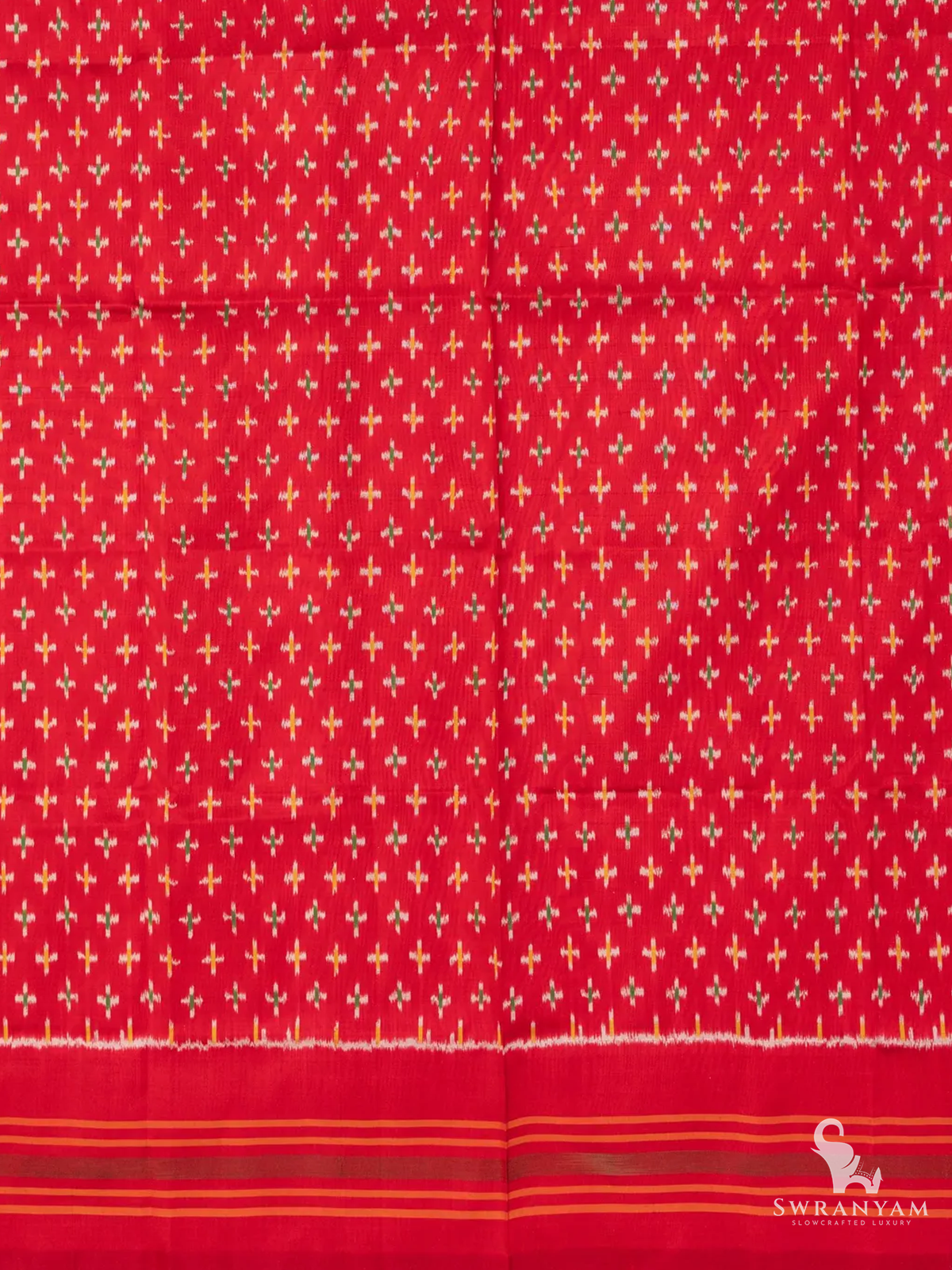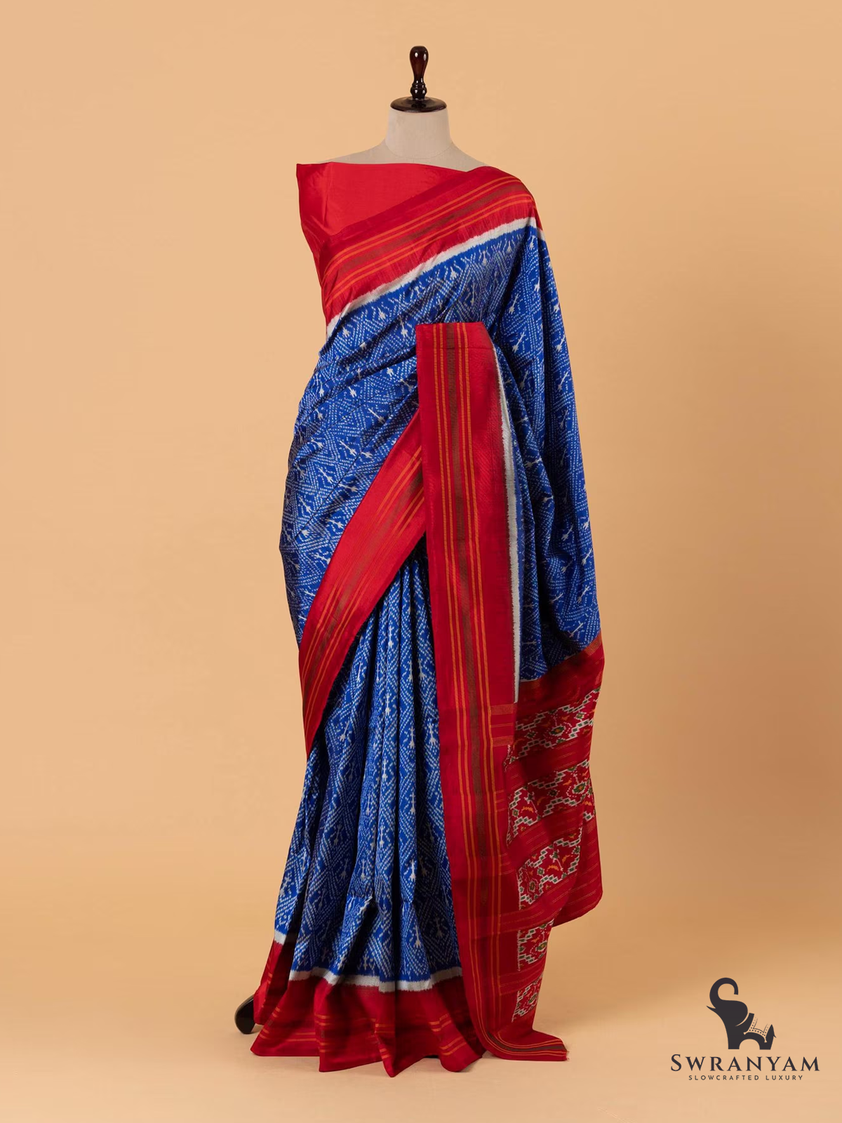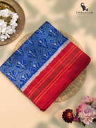 Paired with an unstitched red silk blouse featuring a woven border, the saree is pre,stitched with fall and pico and finished with handcrafted silk tassels – ready to wear for festive occasions, cultural gatherings, or elegant evening wear.