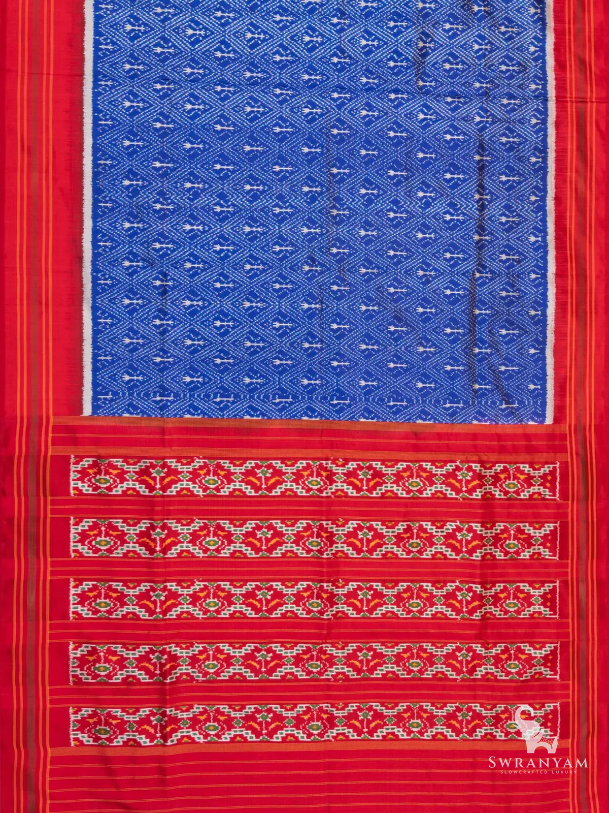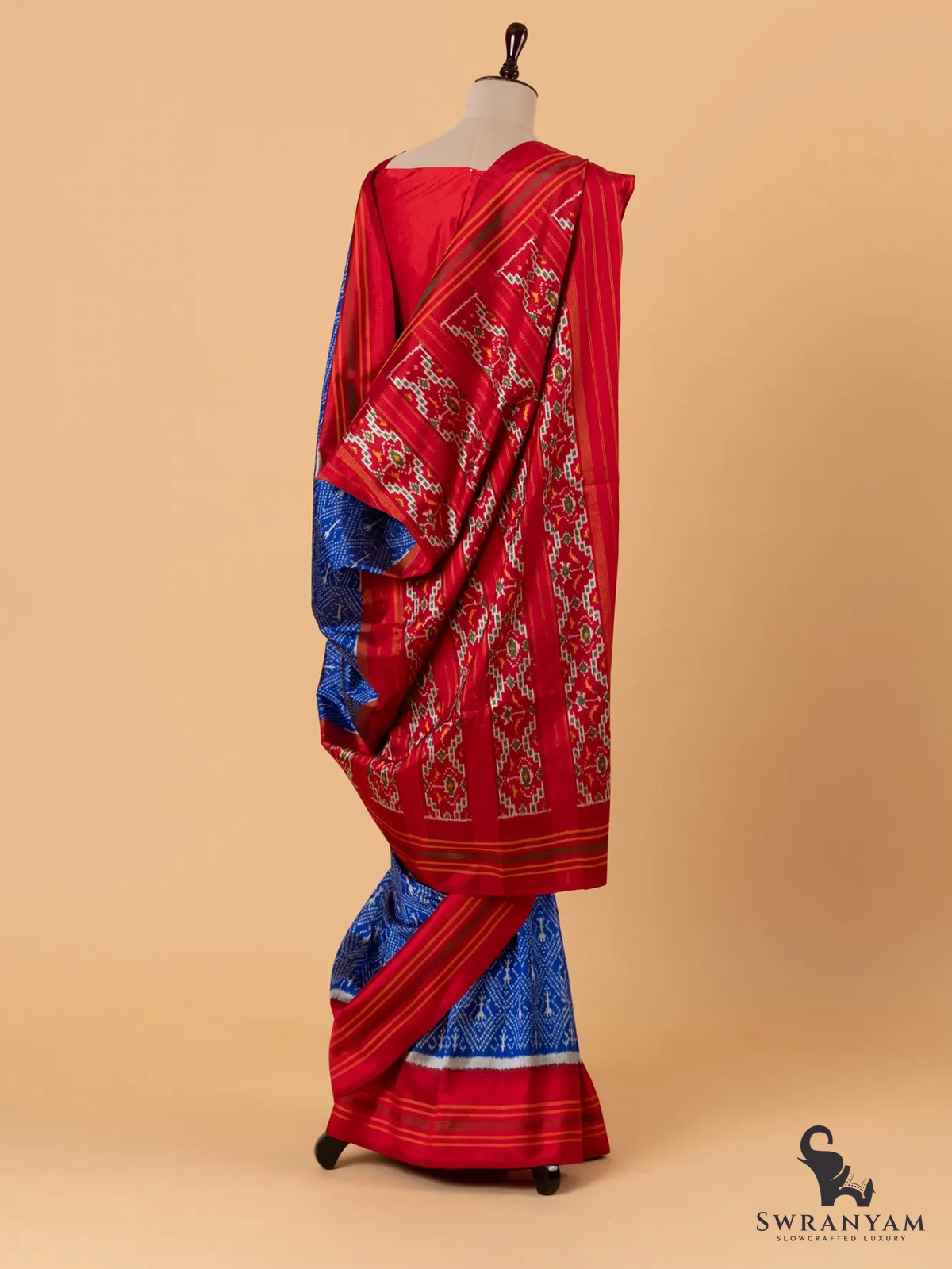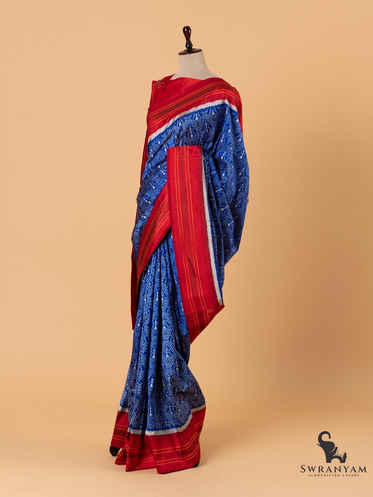 Paired with an unstitched red silk blouse featuring a woven border, the saree is pre,stitched with fall and pico and finished with handcrafted silk tassels – ready to wear for festive occasions, cultural gatherings, or elegant evening wear.