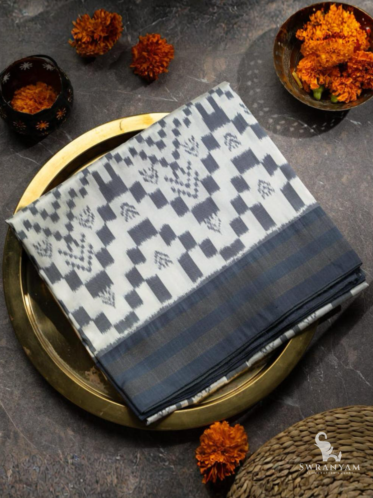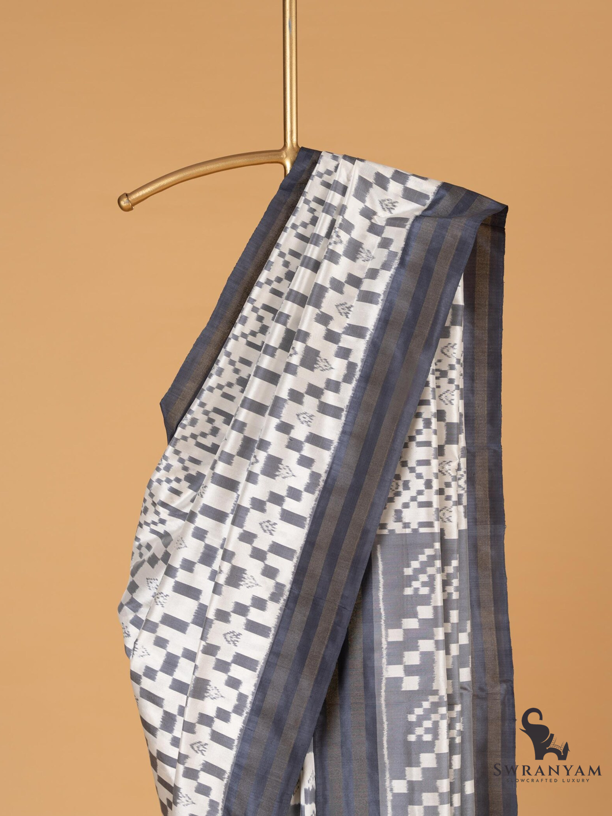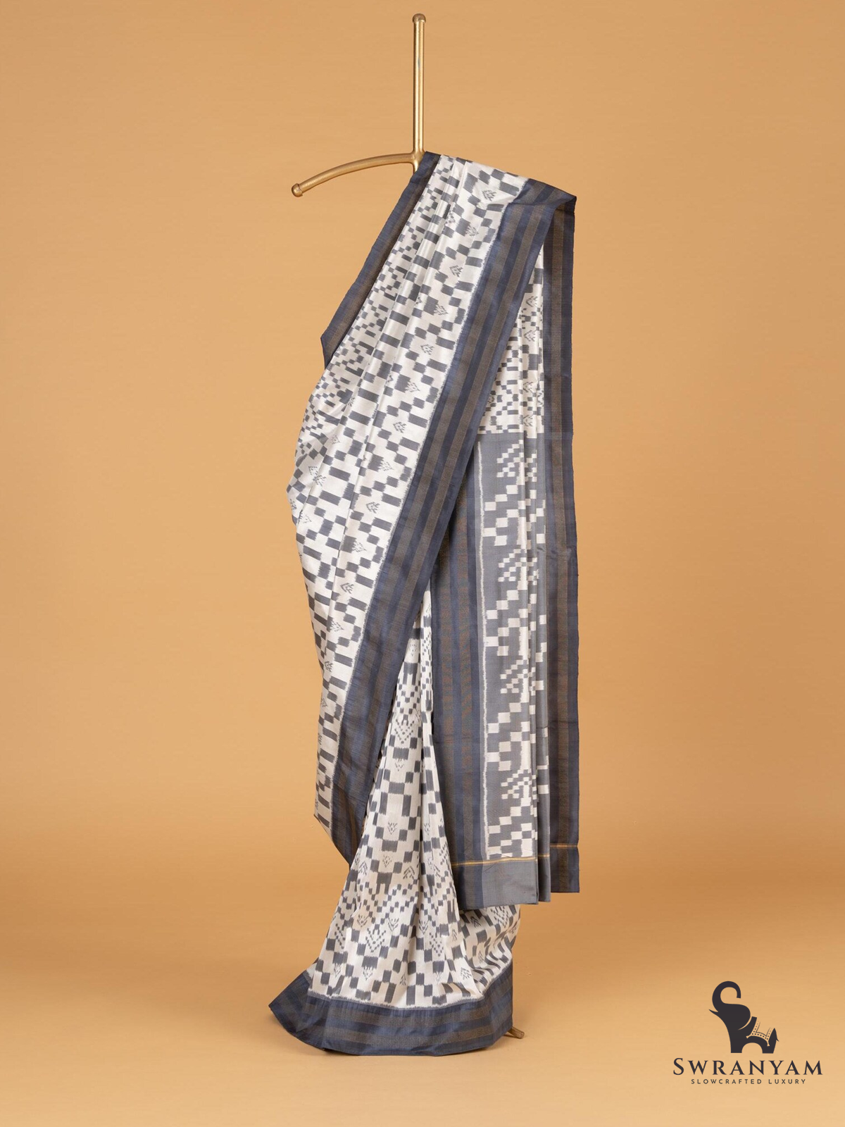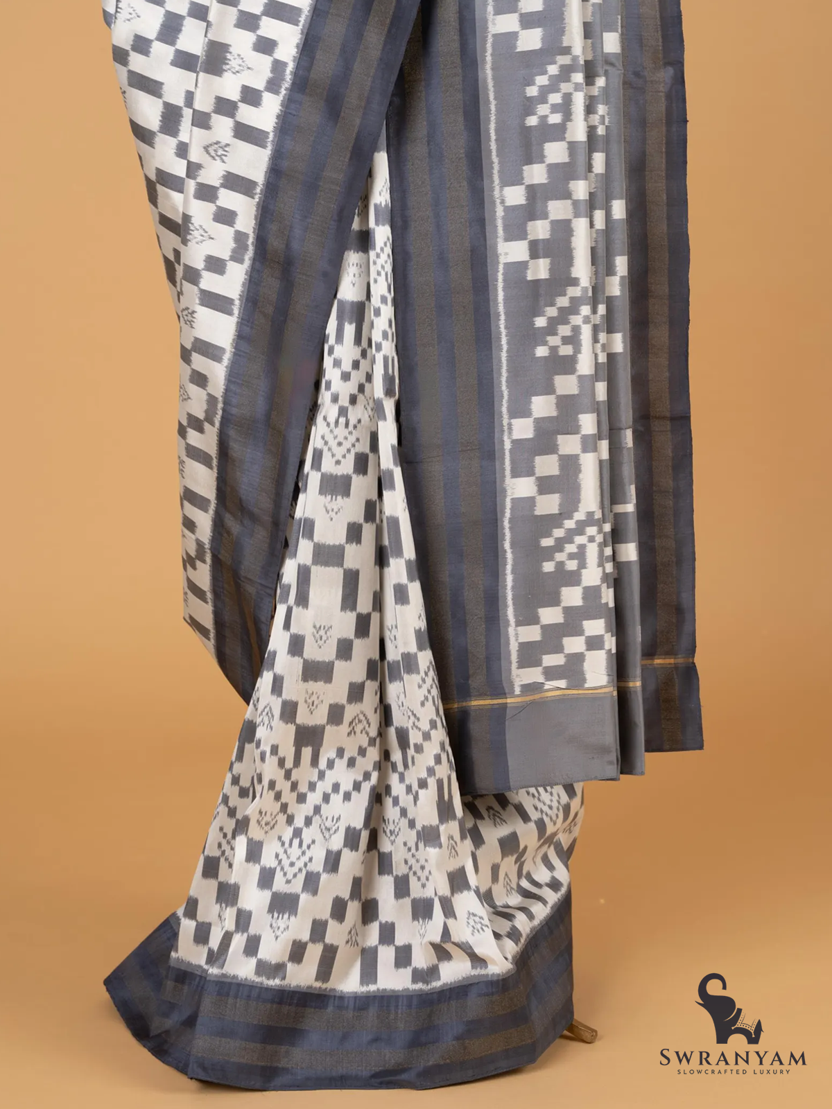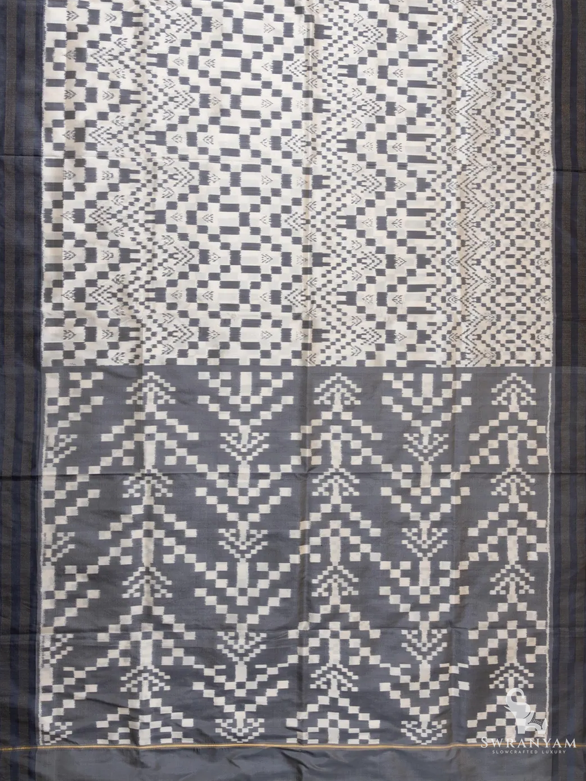 Pure Ikkat Silk Saree in Gray and White Weft with Dark Gray Border, Lightweight Elegance, Handwoven, Silk Mark Certified and Ready to Wear