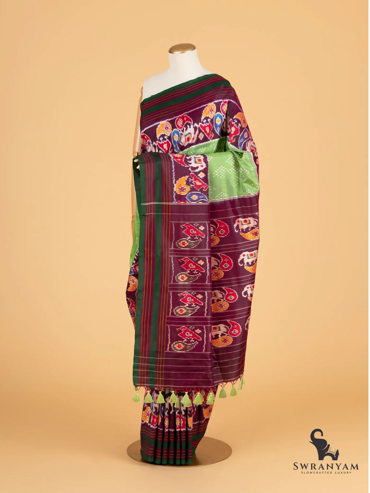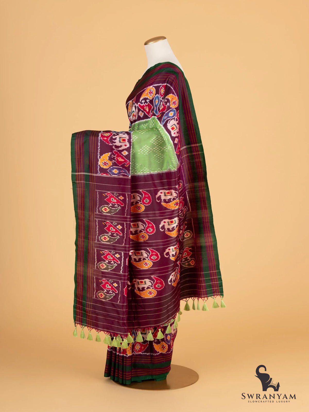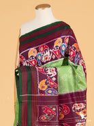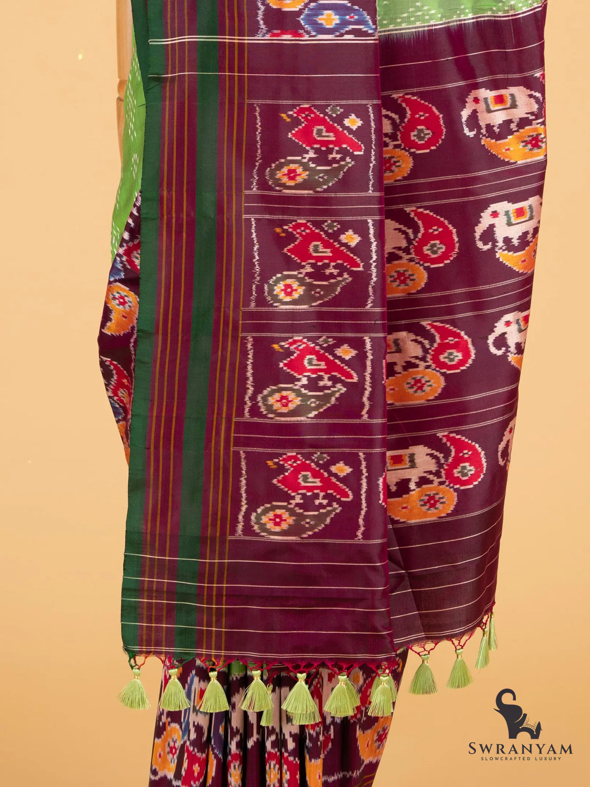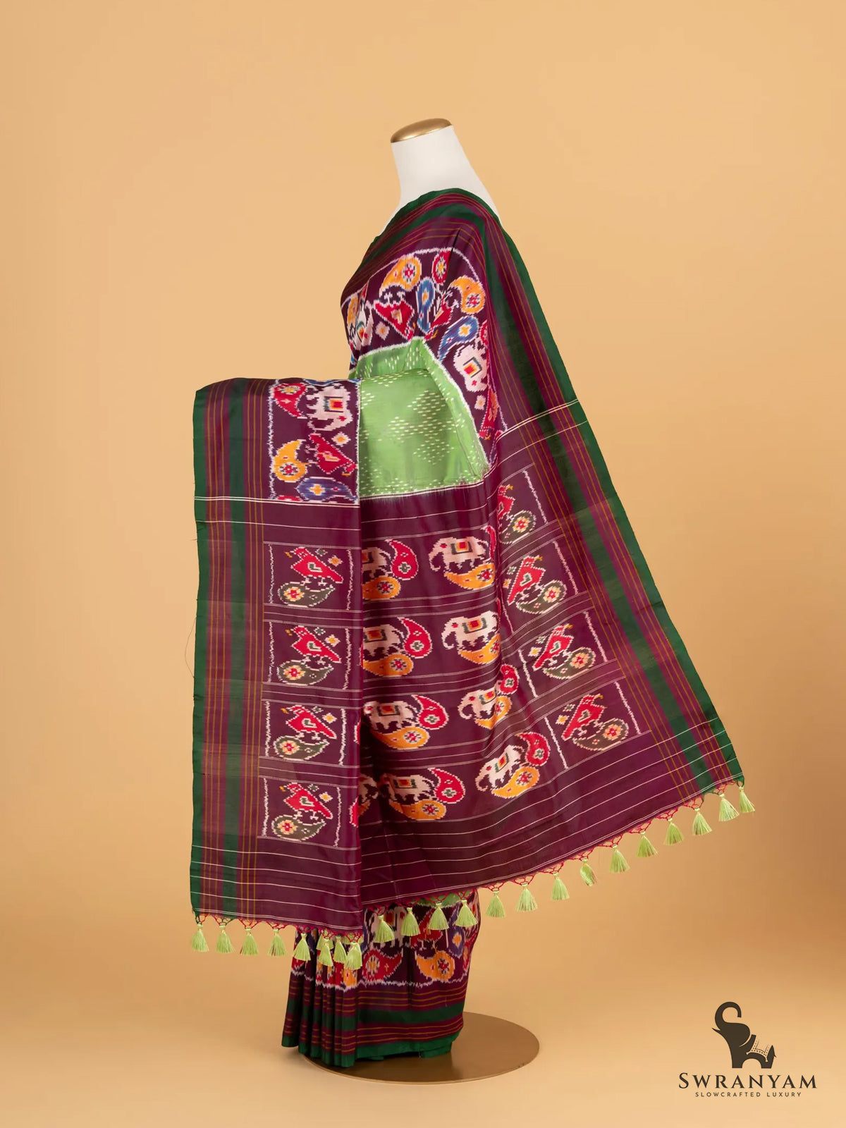 Pure Ikkat Silk Saree in Green and Maroon with Elephant Motifs and Self Borders, Lightweight Elegance, Handwoven, Silk Mark Certified and Ready to Wear
