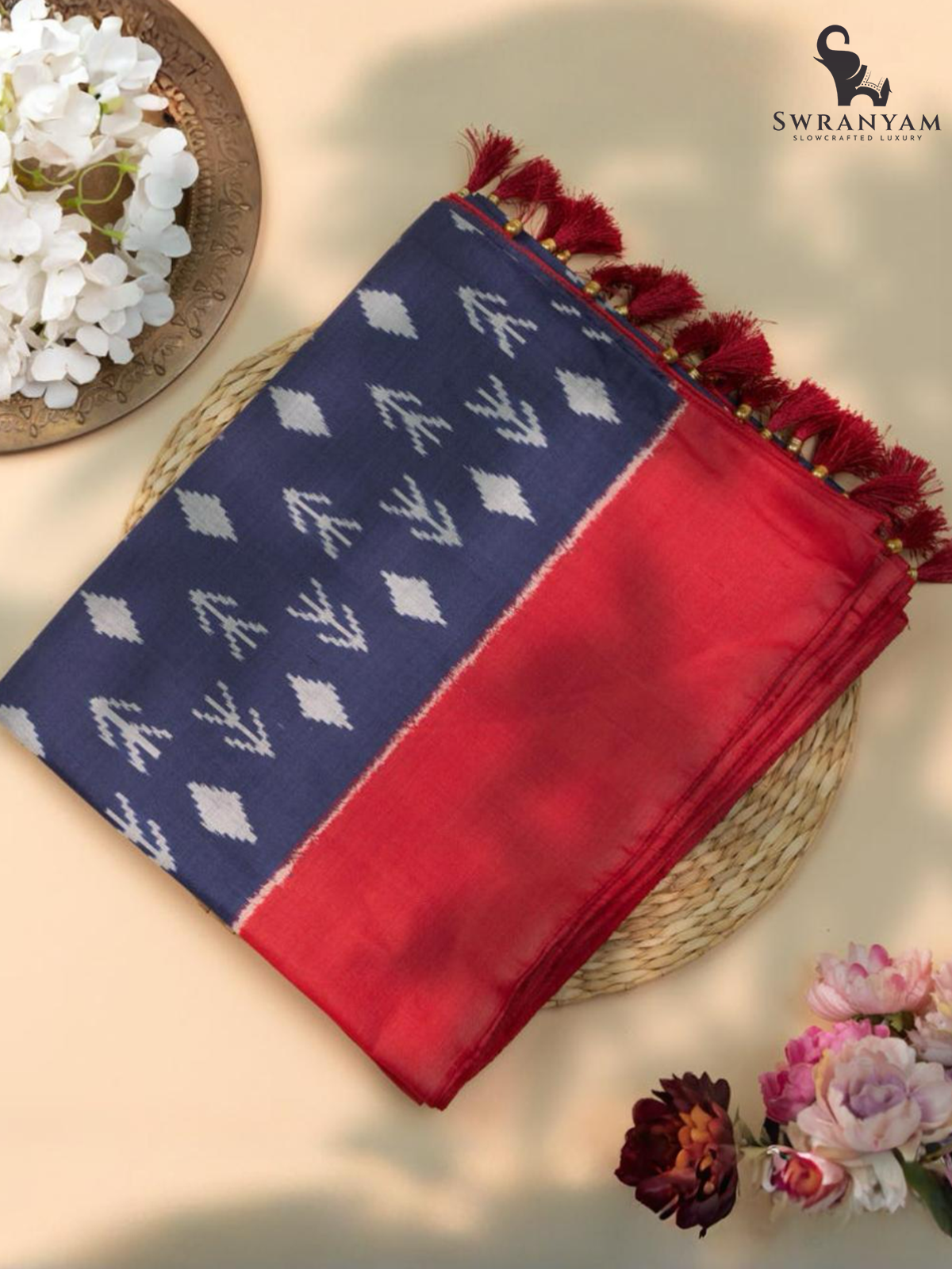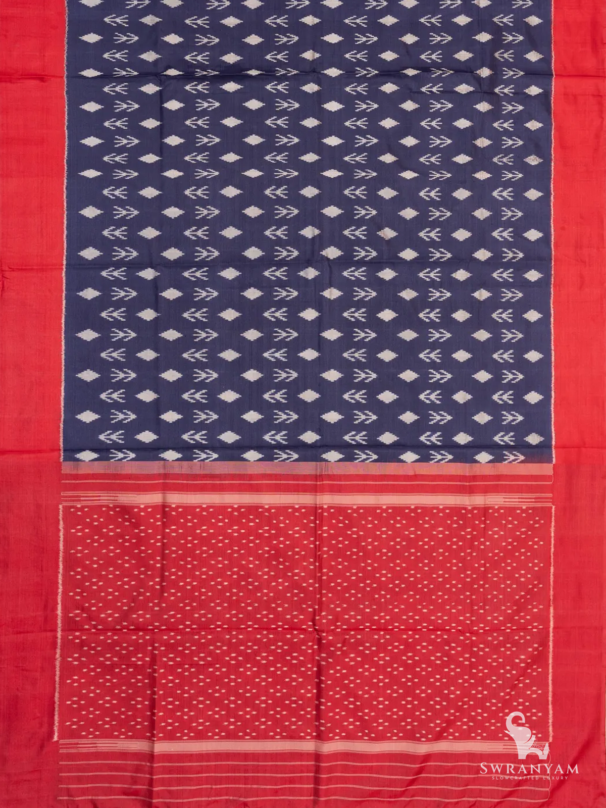 ◆ Rich navy blue body with contrasting red woven borders