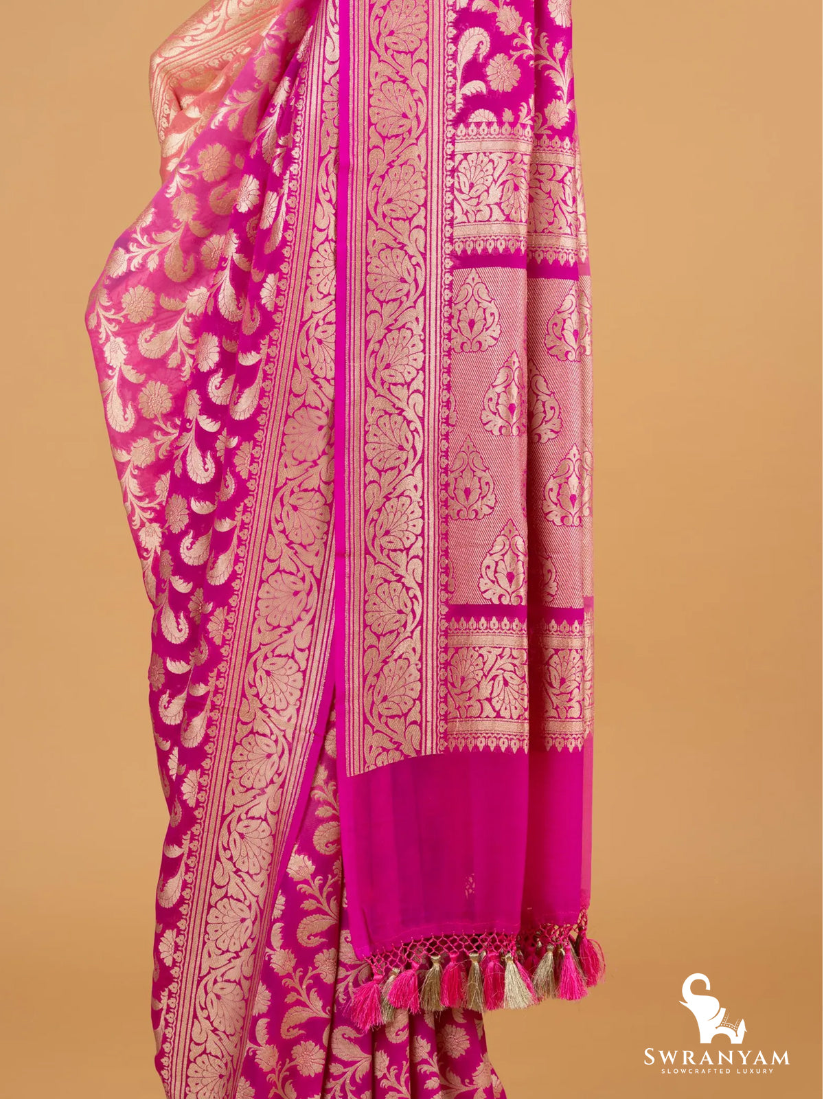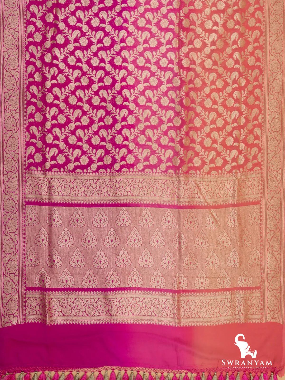 Finished with fall and pico, and adorned with handmade silk tassels, this saree blends heritage with modern finesse.