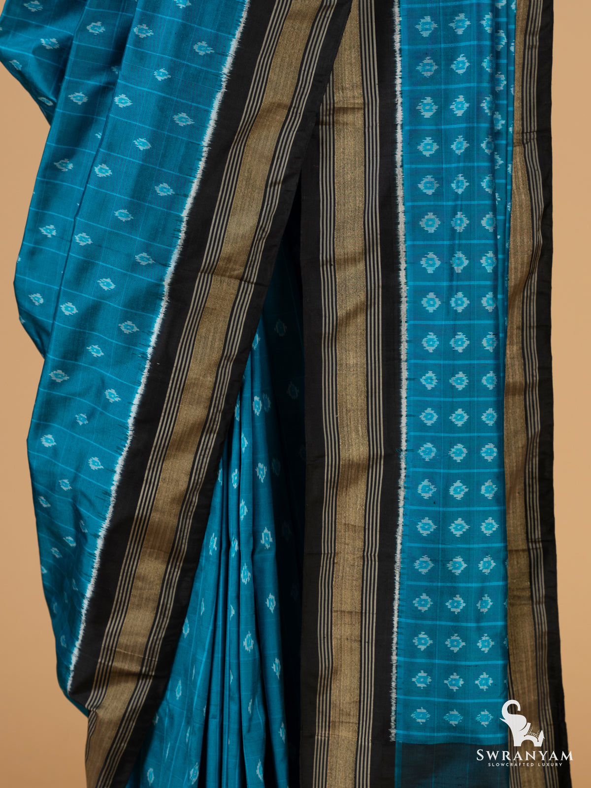 The fresh Blue Ikat weave body dances subtly with the glimmer of woven detailing, while the Black silk borders and pallu create a vibrant frame that turns every glance into admiration. Whether you're attending a festive celebration or simply embracing your heritage, this piece is sure to be your go,to symbol of elegance. A delicate touch of handmade silk tassels on the pallu adds a soft, luxurious finish that flows with grace.