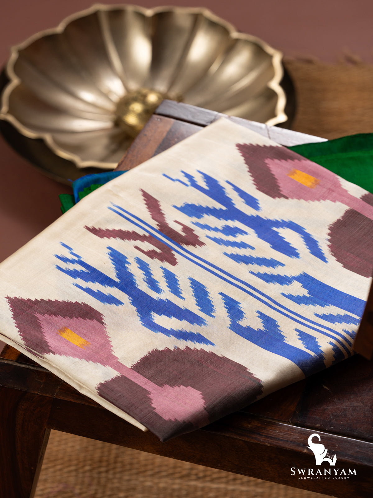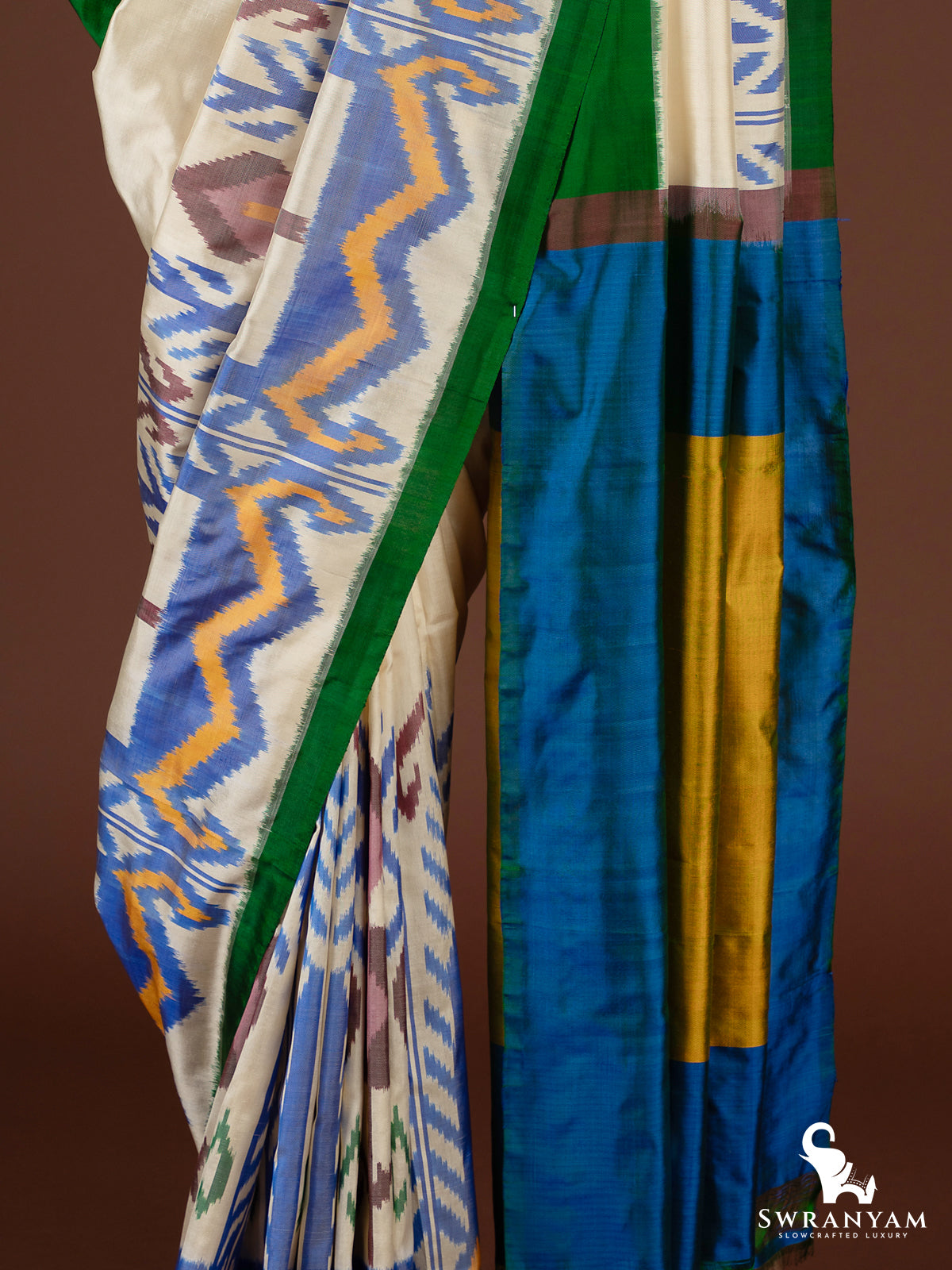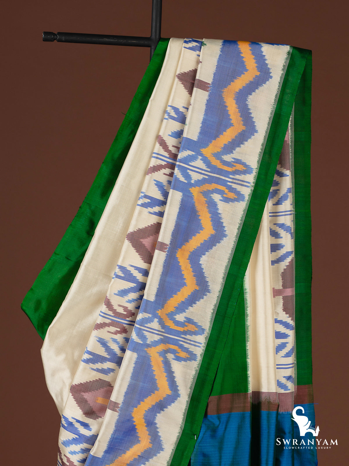 ◆ Fresh cream body with vibrant Uzbek ikkat multicolour design, bordered in green with a bold pallu
